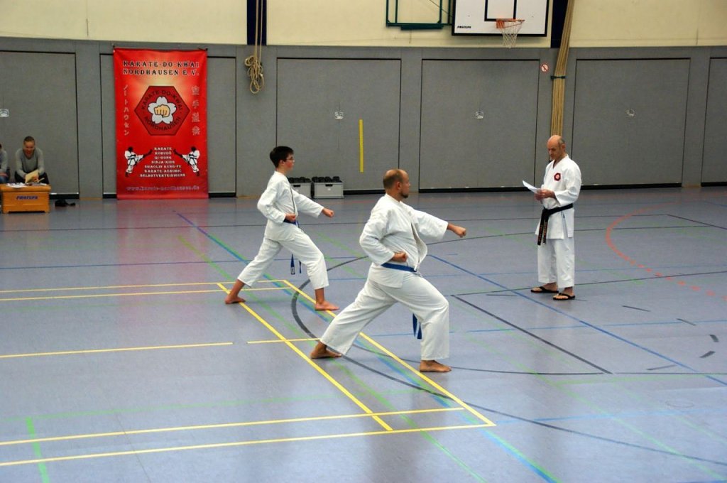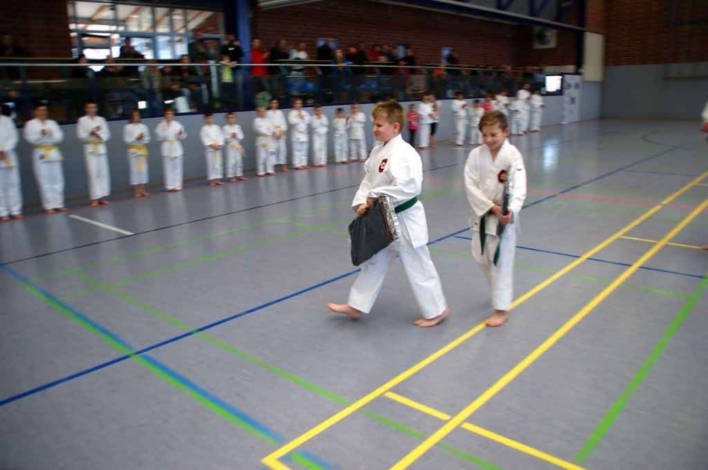 Mit Punktgleichstand wurden diesmal Arnim Lepperhoff und Konstantin Probst die Dritten im Bunde. Sie bekamen als Prämie jeweils ein Karatebuch. Im Anschluss an die Trainingseinheiten wurde es aber noch einmal richtig ernst. Wer zugelassen war, durfte sich der Prüfung zum nächsthöheren Schülergrad in Shotokan-Karate stellen. Unter den kritischen Augen des Prüfers konnten 24 Karateka ihr Prüfungsprogramm überzeugend darbringen und am Ende sich völlig verdient einen neuen Gürtel mit einer dunkleren Gürtelfarbe umbinden.