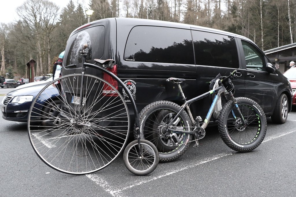 Von ganz jung bis relativ alt, vom Hochrad bis zum Fatbike, fast jede Fraktion war vertreten. Mit dem Hochrad ist dann allerdings doch niemand hochgefahren, es war eher die Attraktion auf dem Parkplatz.