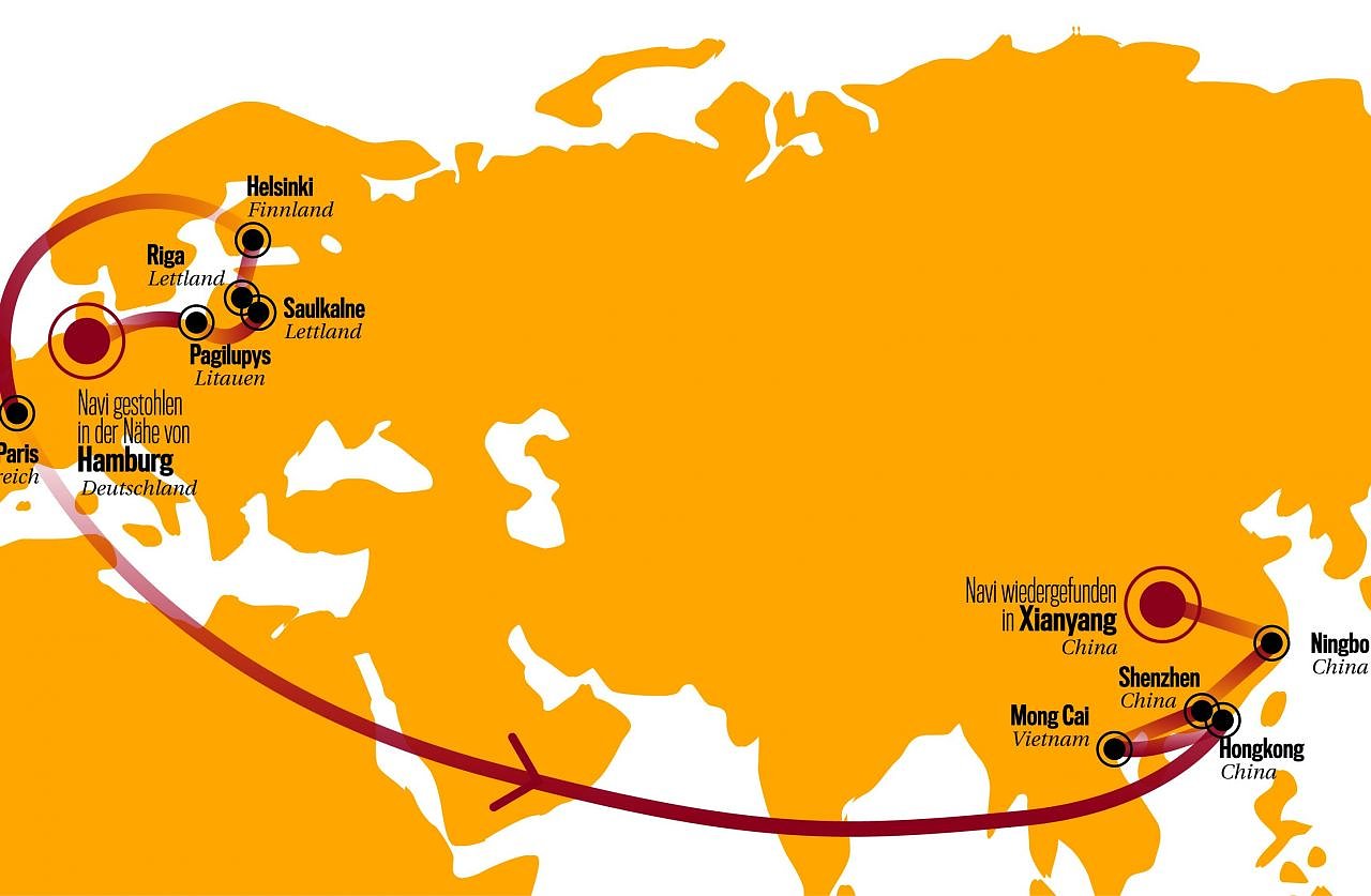 Von Hamburg kommt das GPS-Gerät zunächst über Litauen nach Riga und Helsinki, bevor es am 19. Dezember 2015 im Luftfrachtsektor des Pariser Flughafens Charles de Gaulle landet. Das nächste Ziel: Honkong. Die Stadt gehört politisch zu China, besitzt aber den Status eines Freihafens. So können Waren aus aller Welt günstig umgeschlagen werden. Vermutlich geht es für das Navi danach auf dem Seeweg weiter nach Vietnam, von wo aus es nach China geschmuggelt wird.