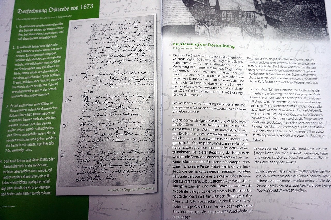 Sie enthält das ausführliche Programm zum Festwochenende vom 17. bis zum 19. Juni, die Ersterwähnung der Gemeinde und die Dorfordnung aus dem Jahr 1673. Diese ist in Sütterlinschrift geschrieben und wurde in den letzten drei Monaten von Jürgen Fiedler übersetzt, damit sie auch heute noch lesbar ist. Genannt werden auch Persönlichkeiten von Osterode, stellte Christiane Arnholdt die Festschrift vor. So finden beispielsweise Louise Dumont und Hildegard von Gierke, die die Staatliche Berufsschule für Kindergärtnerinnen in Osterode leitete, Erwähnung.
