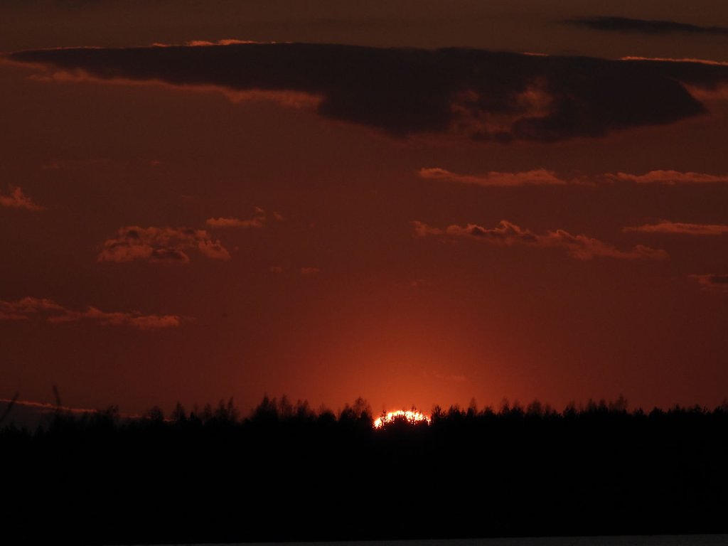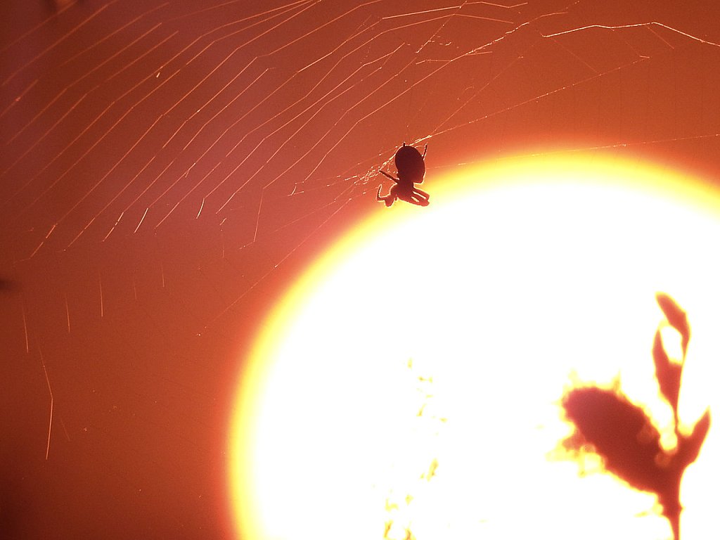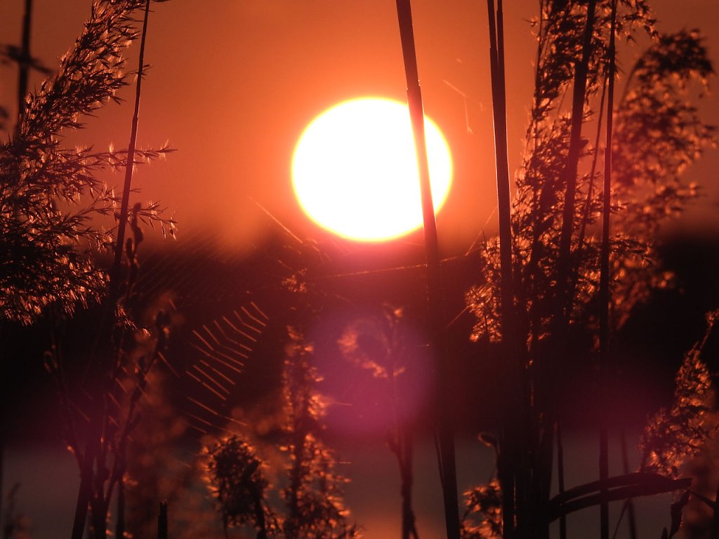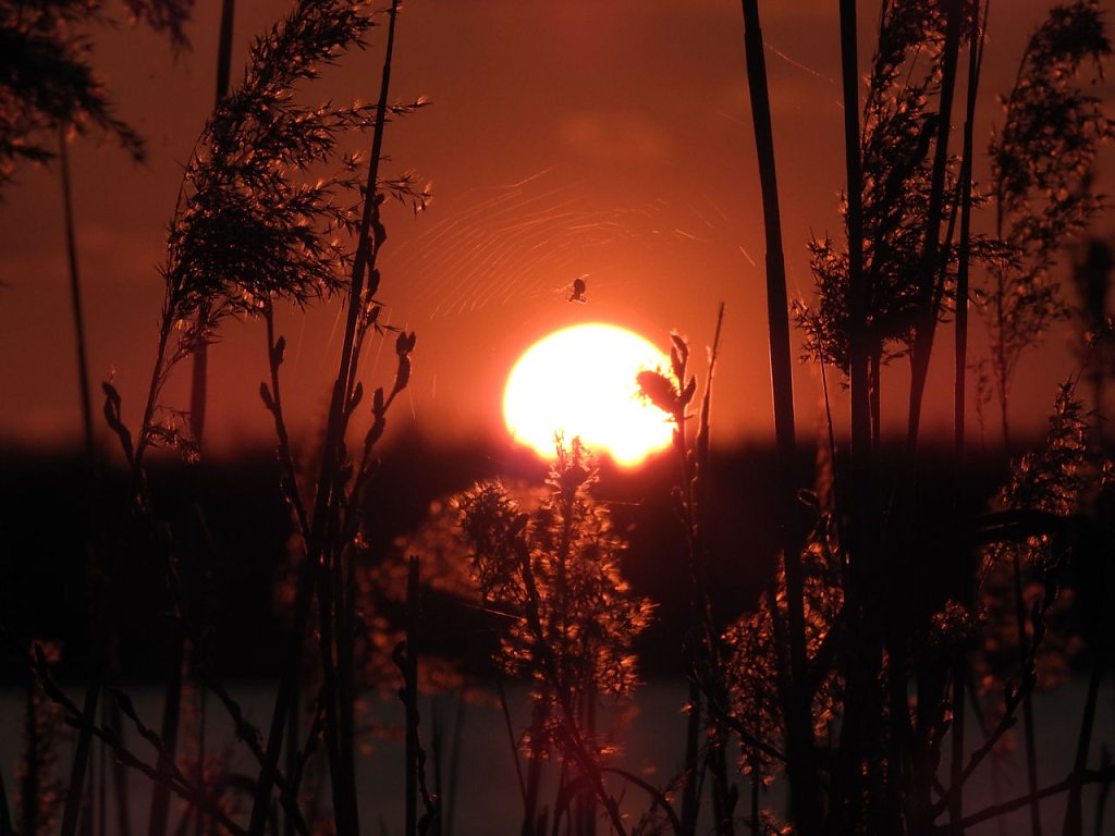 Biberspuren fanden wir jede Menge, bloß keine Tiere. Stattdessen wurden wir dafür mit einem spektakulären Sonnenuntergang belohnt. Ein Spinnennetz plus Spinne drängte sich förmlich in das Bild. Wer schon mal in die Sonne fotografiert hat, weiß das dies nicht einfach ist.