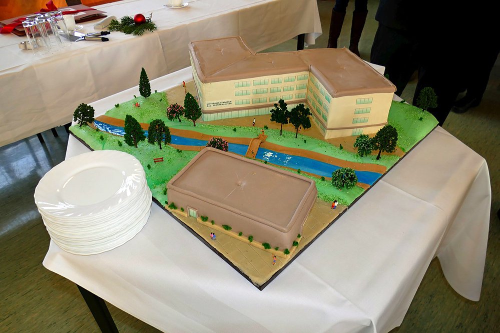 In der Aula des Kyffhäusergymnasiums wurde heute der Förderbescheid des Bundes übergeben. Es geht um den Neubau des Kyffhäusergymnasiums, das hier bereits als Tortenversion zu sehen ist.
