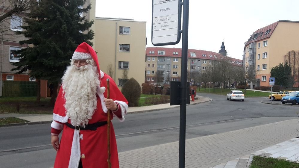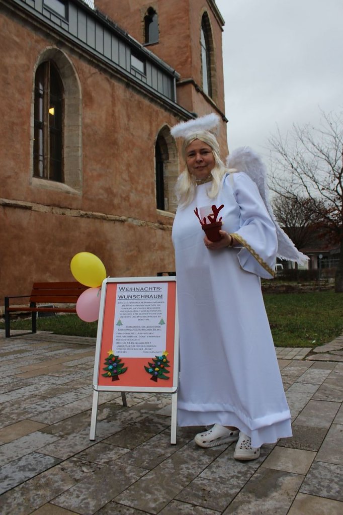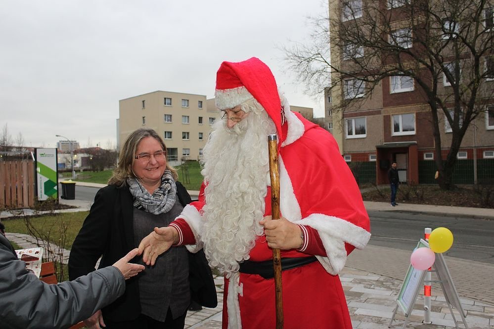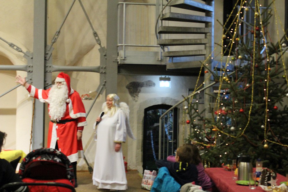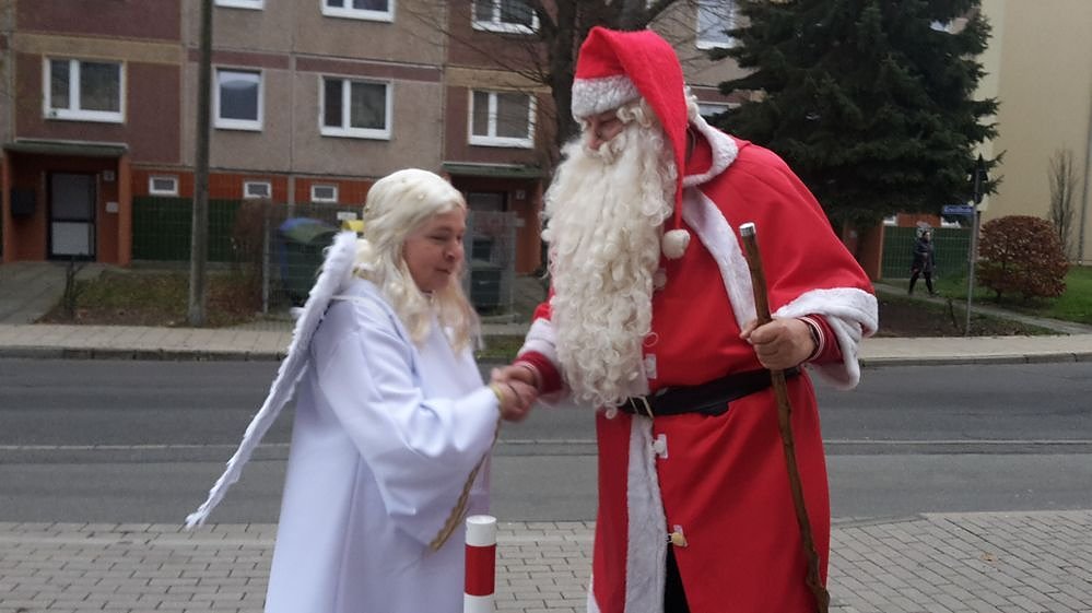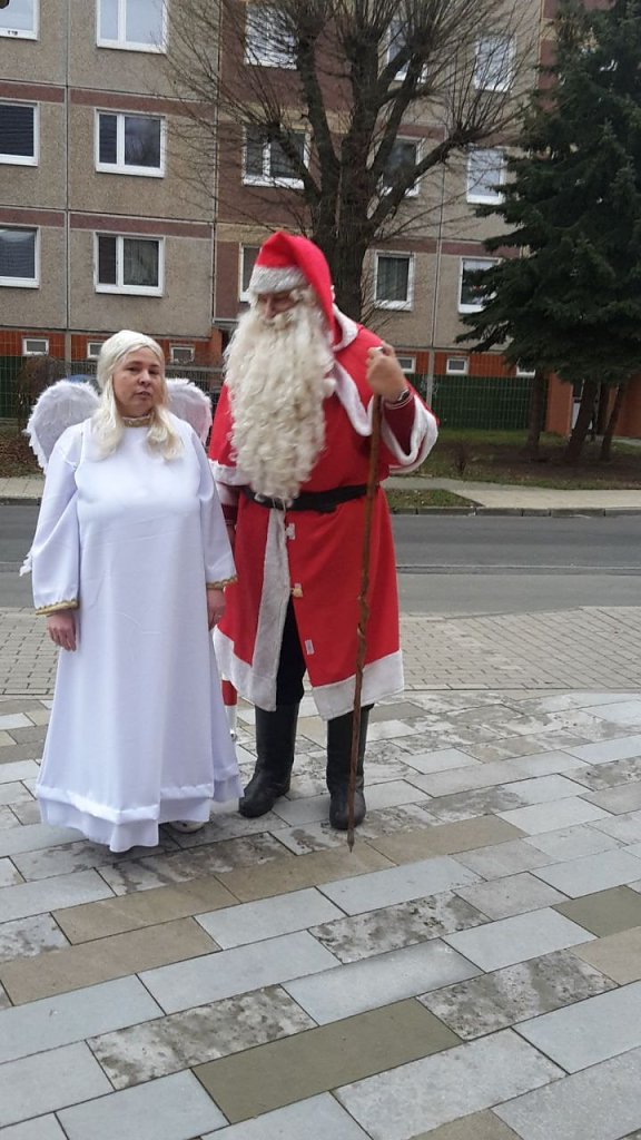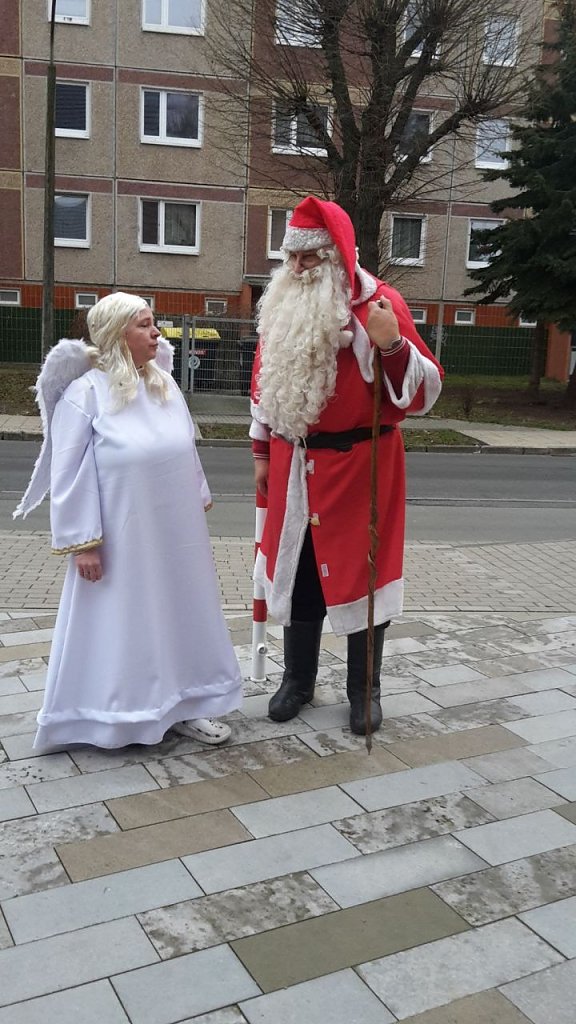 Der Weihnachtsengel, im bürgerlichen Leben Sandra Blunk vom Verein Düne e.V., hatte den Weihnachtsmann vorzeitig nach Sondershausen gerufen, um die Geschenke zu verteilen. Wegen Mangel an Schnee musste der Gute gar zu Fuß kommen, wie die Bilder von der Ankunft zeigen.