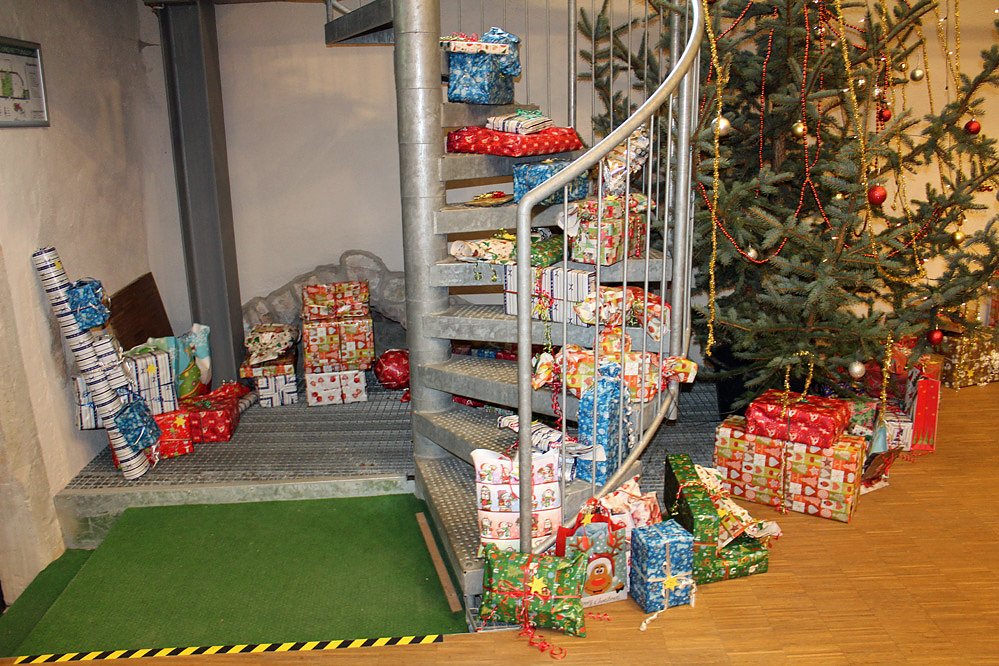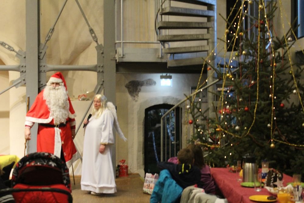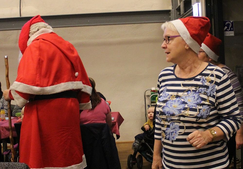 Er war aber nicht so geschafft, dass er nicht die Geschenke an alle verteilen konnte. Damit es nicht zu ungeduldigen Wartezeiten bei 99 zu verteilenden Geschenken kam, hatte man nach einer Tafel mit Kaffee und Kuchen, die Gruppe geteilt. Während in der einen Gruppe ein Weihnachtsspiel lief, teilte in der anderen Gruppe der Weihnachtsmann die liebevoll von Bürgern eingepackten Geschenke aus.
