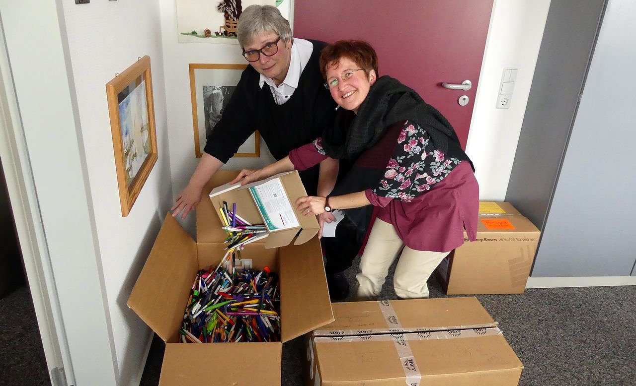 Von Anfang an war die energiegeladene Frau von der Aktion des deutschen Weltgebetstagskomitees Stifte machen Mädchen stark fasziniert. Das Ziel dieses Projekts ist es, mit jeweils 450 leeren gesammelten Stiften ein syrisches Mädchen in einem libanesischen Flüchtlingscamp mit Schulmaterial zu versorgen. Die Stifte werden recycelt und pro Stift wird der Aktion 1 Cent gut- geschrieben.