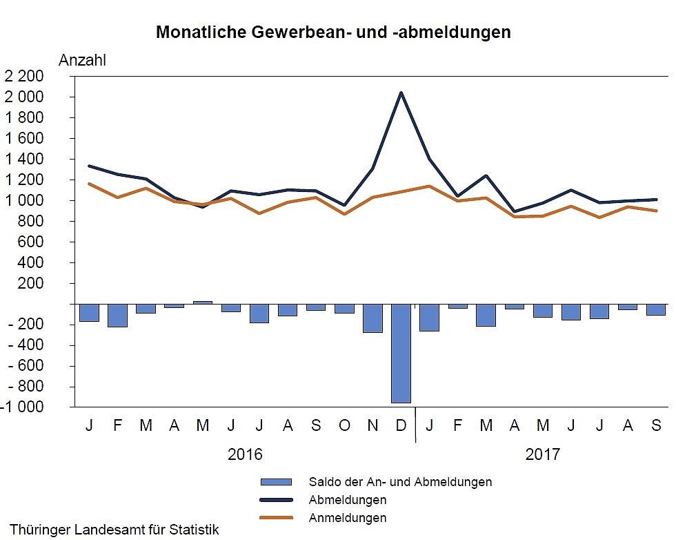 In Thüringen gab es von Januar bis September 2017 gegenüber dem vergleichbaren Vorjahreszeitraum sowohl weniger Gewerbeanmeldungen als auch weniger Gewerbeabmeldungen. Die Anzahl der Anmeldungen verringerte sich nach Mitteilung des Thüringer Landesamtes für Statistik auf 8 478 Anzeigen (- 692 Anzeigen bzw. – 7,5 Prozent)...