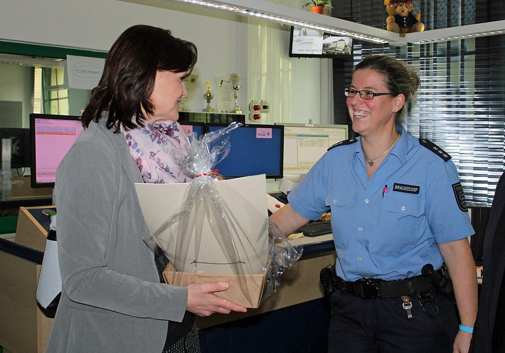Hier erhielt die "Schichtleiterin" Polizeihauptkommissarin Manja Braunsdorf den obligatorischen Präsentkorb.