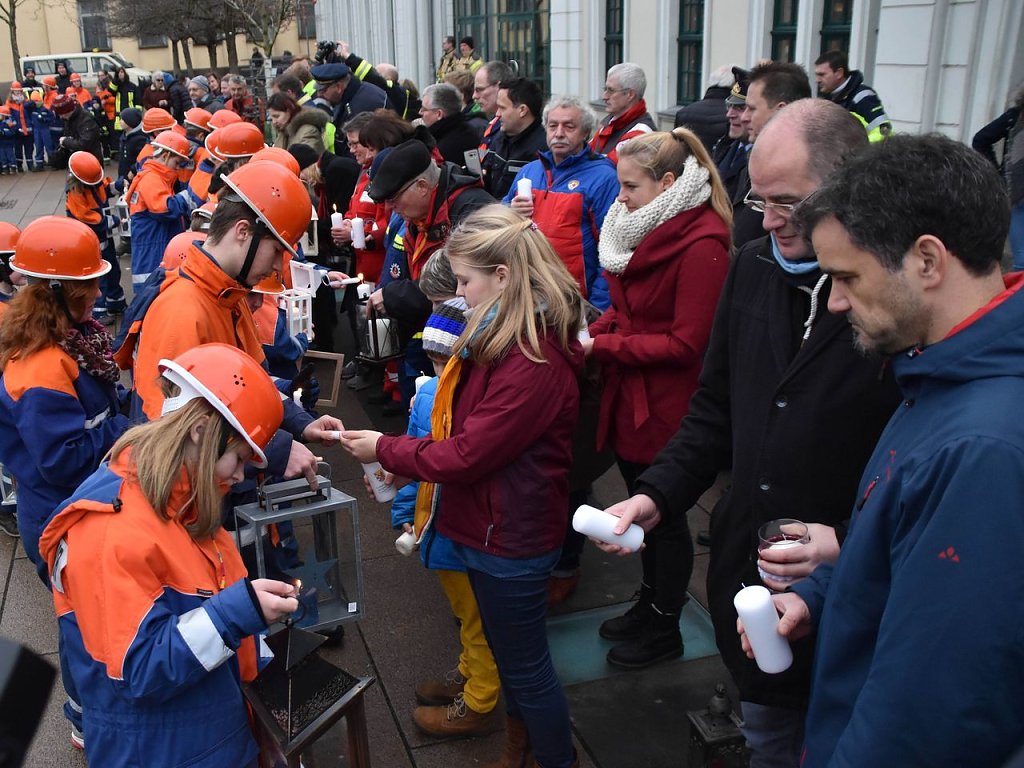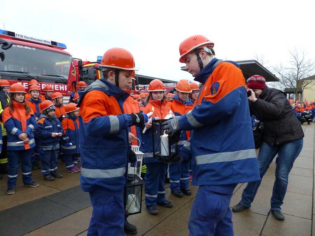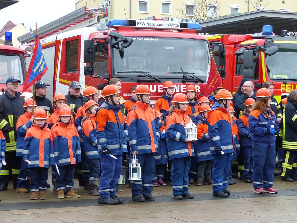 Über 200 Kinder und Jugendliche aus 24 Jugendwehren des Landkreises Nordhausen, dem THW, der Bergwacht und Pfadfindern waren angetreten, um das Licht weiter zu verteilen, um es in die vielen Gemeinden zu bringen. Die Jugendfeuerwehrwartin des Landkreises Nordhausen, Manja Bernsdorf, begrüßte denn zu Beginn auch alle, die gekommen waren und las dann erst einmal die lange Liste der besonderen Gäste vor. Es sind die gleichen wie im vergangenen Jahr - bis auf eine Ausnahme: Zum ersten Mal bekam Kai Buchmann in seiner Funktion als Oberbürgermeister ein Licht überreicht.