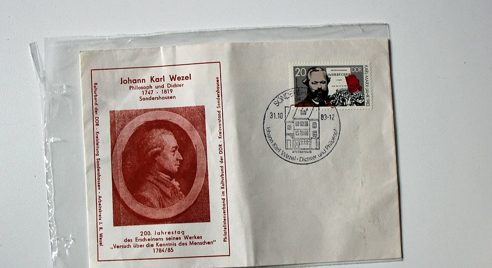 Diesen Brief mit einem Sonderstempel hatte Gerhard Axt mit gebracht, der sich in den letzten Jahren vehement für die bessere Ehrung von Wezel in Sondershausen eingesetzt hatte.