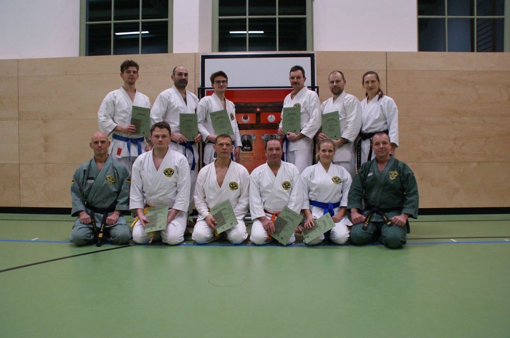 Im Anschluss an den Lehrgang eröffneten die Karateka den Vereins-Prüfungsreigen. Gleich 25 Schüler bestanden die Aufgaben für den nächsten Rang und können sich ab sofort einen neuen, etwas dunkleren Gürtel umbinden. Knapp eine Woche später stellten sich auch die Senioren aus der Gruppe 60+ den kritischen Augen des Prüfers. Zu viert bewiesen sie mit guten Leistungen, dass sie auch im reiferen Alter noch den Anforderungen gewachsen sind. Am 18. Dezember folgte dann als krönendes Finale ein Doppelschlag. Zunächst absolvierten drei Teilnehmer die Prüfungen im Ryûkyû Kobudô Tesshinkan, dem Karate mit alten Bauernwaffen von Okinawa/Japan. Unmittelbar im Anschluss folgten darauf die SaCO-Selbstverteidiger. Mit überzeugenden Demonstrationen bestanden hier am Ende neun Kämpfer die Herausforderungen, die ihnen laut Prüfungsprogramm und im Kampfkreis gestellt wurden.