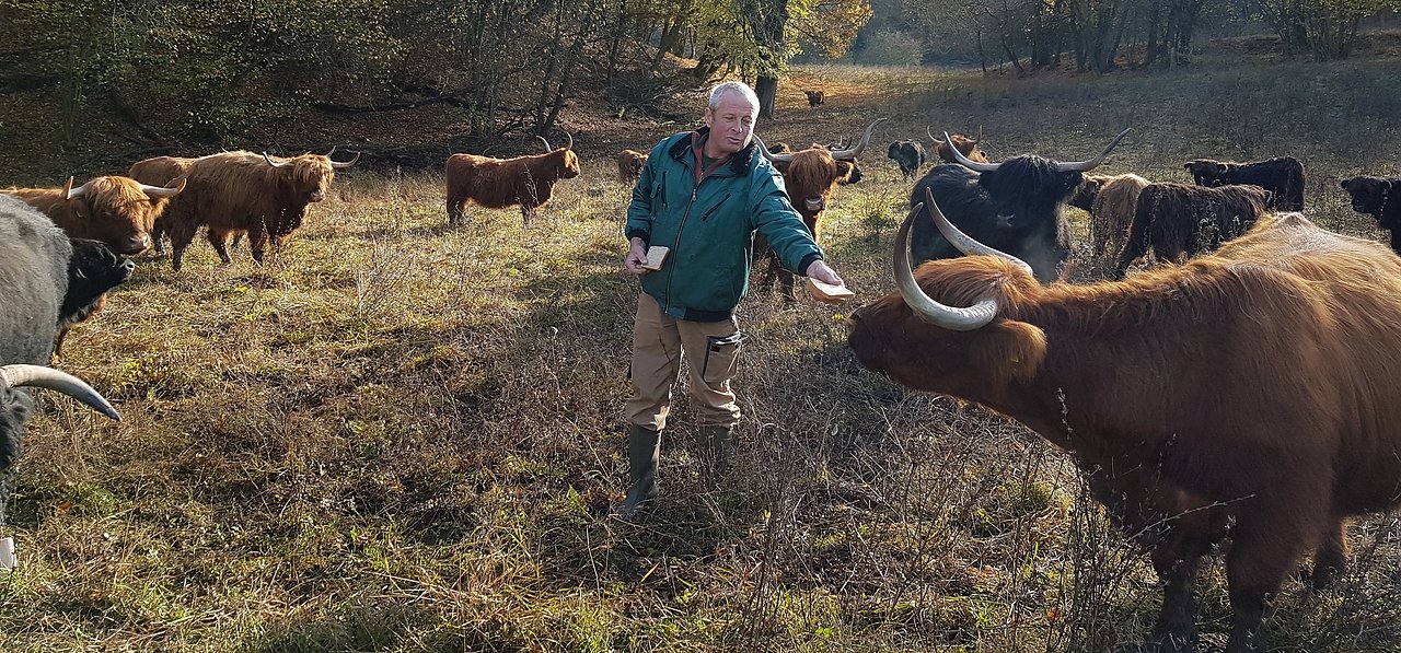 Meyk Forst mit der Herde Schottisches Hochlandrind auf einer Weide in der Rüdigsdorfer Schweiz. (Foto: Kurt Frank)