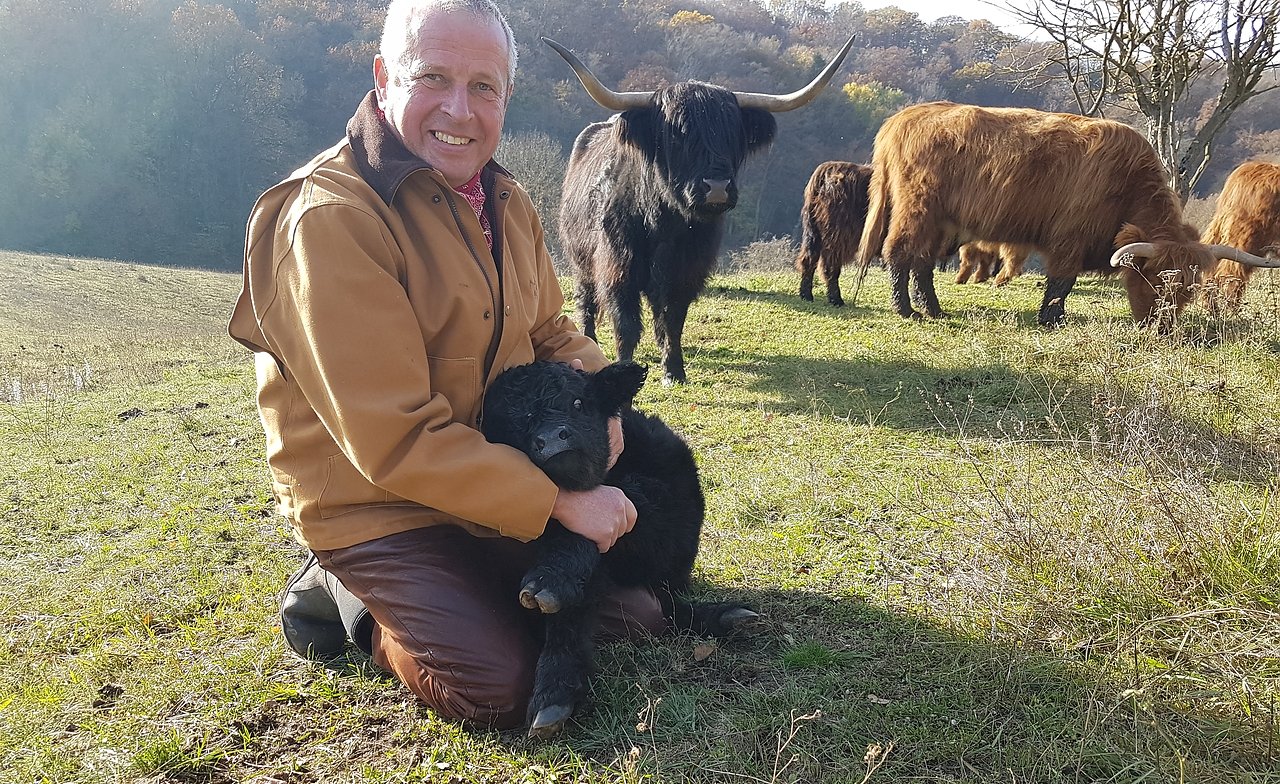 Erst zwei Tage alt ist dieses Kälbchen, das Meyk Forst liebevoll umarmt. Im Hintergrund das dunkle Tier der Rasse Schottisches Hochlandrind ist die Mutter des Kleinen. (Foto: Kurt Frank)