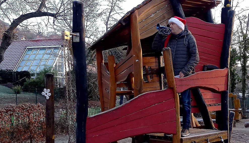 Die Kinder der integrativen Kindertagesstätte in Bad Frankenhausen hörten am Dienstag plötzlich Trompetenmusik und liefen aufgeregt zum Fenster. Im Garten der Kindervilla stand auf einmal ein Trompeter...