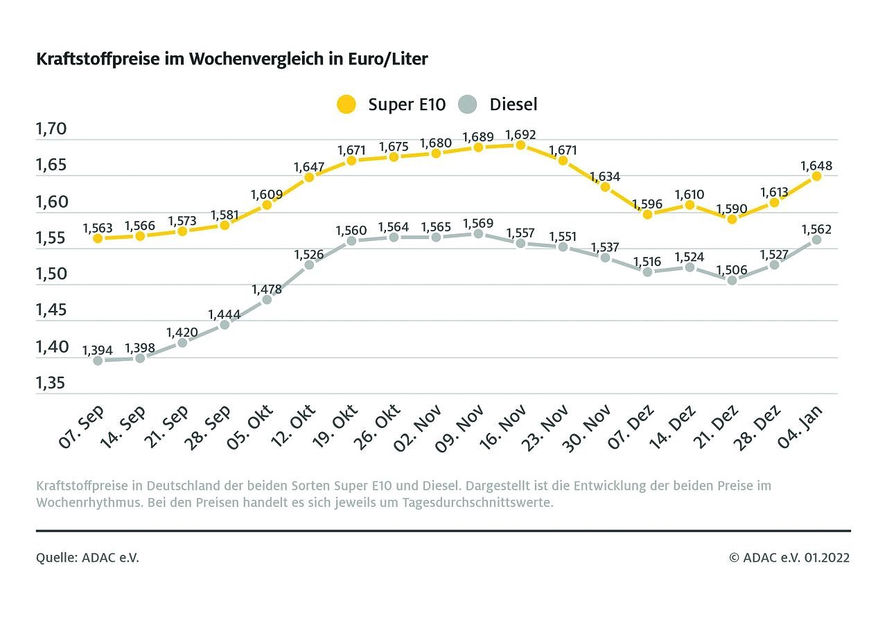 Das neue Jahr startet mit einem Anstieg der Spritpreise. Das ermittelt der ADAC in seinem wöchentlichen Preisvergleich. Demnach kostet ein Liter Super E10 im bundesweiten Mittel 1,648 Euro. Das entspricht einem Anstieg von 3,5 Cent im Vergleich zur Vorwoche...