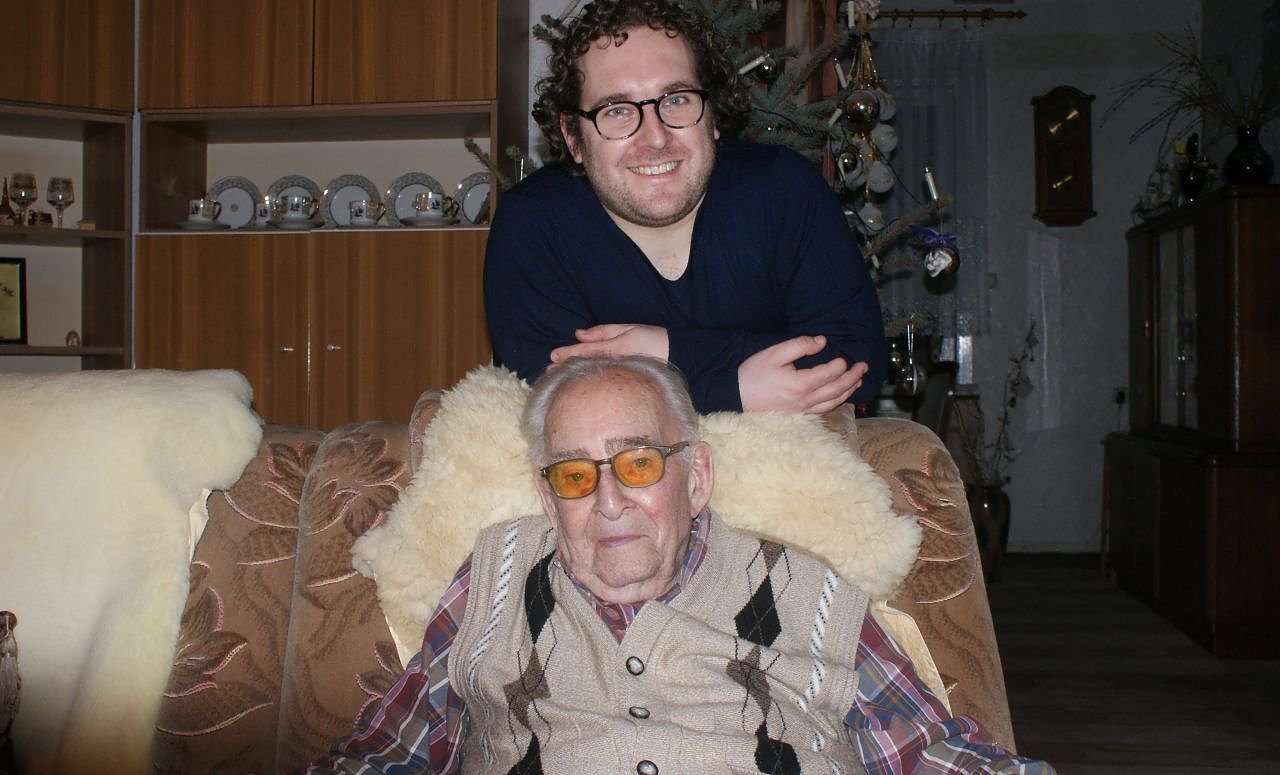 Als kleiner Schuljunge beantworte Maximilian Ströbele die Frage der Lehrerin, worauf er einmal stolz sein würde, umgehend: Wenn mein Opa Rupert 100 Jahre alt wird. Der versprach dem Enkel, sich Mühe zu geben. Opa schaffte es. Heute begeht er mit Familie sein 100. Wiegenfest. Enkel Maximilian, jetzt 31 Jahre alt und gelernter Logistiker, freut sich mit seinem Opa, der sein Versprechen hielt. (Foto: Kurt Frank)