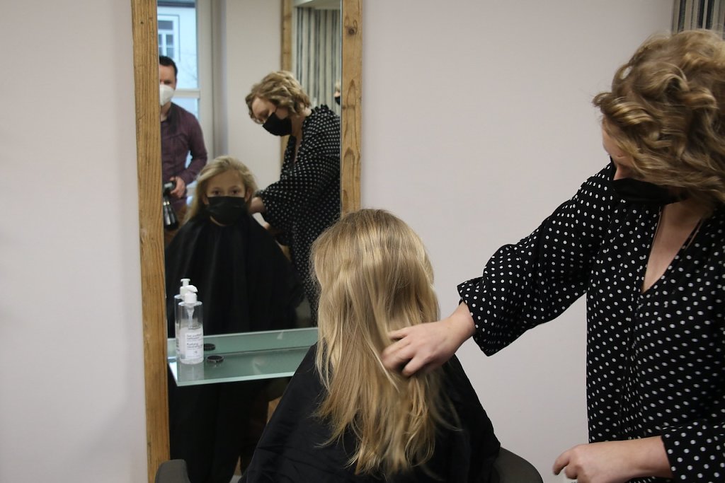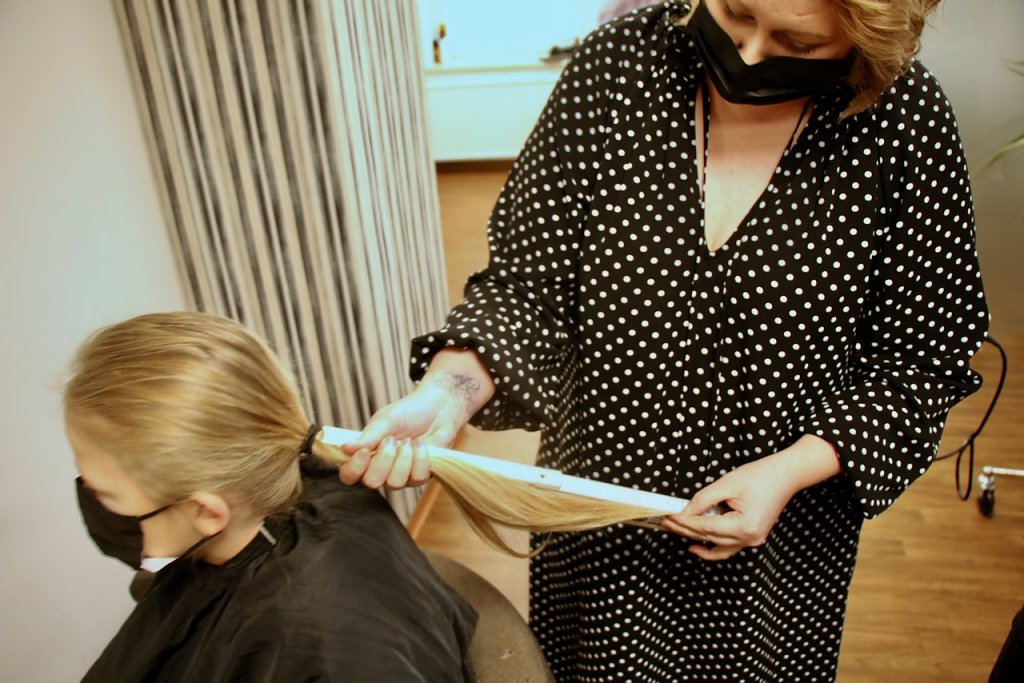 Heute nun war es soweit: die Schere konnten endlich angesetzt werden. Bei einem ersten Besuch im Friseursalon Elementhaar war der Zopf noch ein bisschen zu kurz, jetzt konnte Sophie Heller mit dem Zollstock stolze 34 Zentimeter Haarpracht messen.