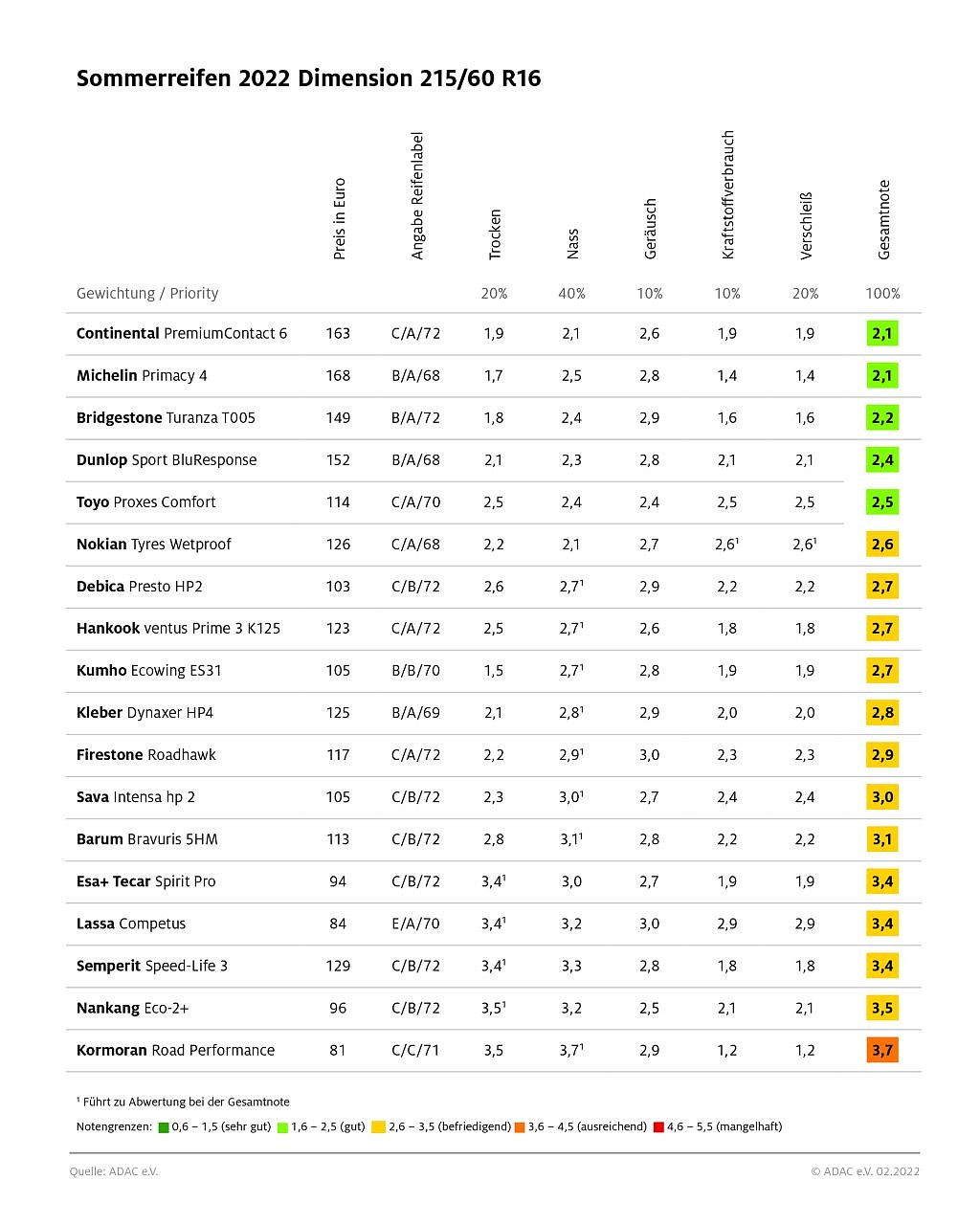 Positive Bilanz beim aktuellen Sommerreifentest des ADAC: Nahezu alle der insgesamt 34 untersuchten Modelle in der Dimension für Kompakt-SUV (215/60 R16 99V) und Kleinwagen (185/65 R15 88H) sind empfehlenswert oder sogar besonders empfehlenswert. Lediglich einen Ausreißer mit der Gesamtnote 3,7 gab es mit dem polnischen Kormoran in der SUV-Klasse...