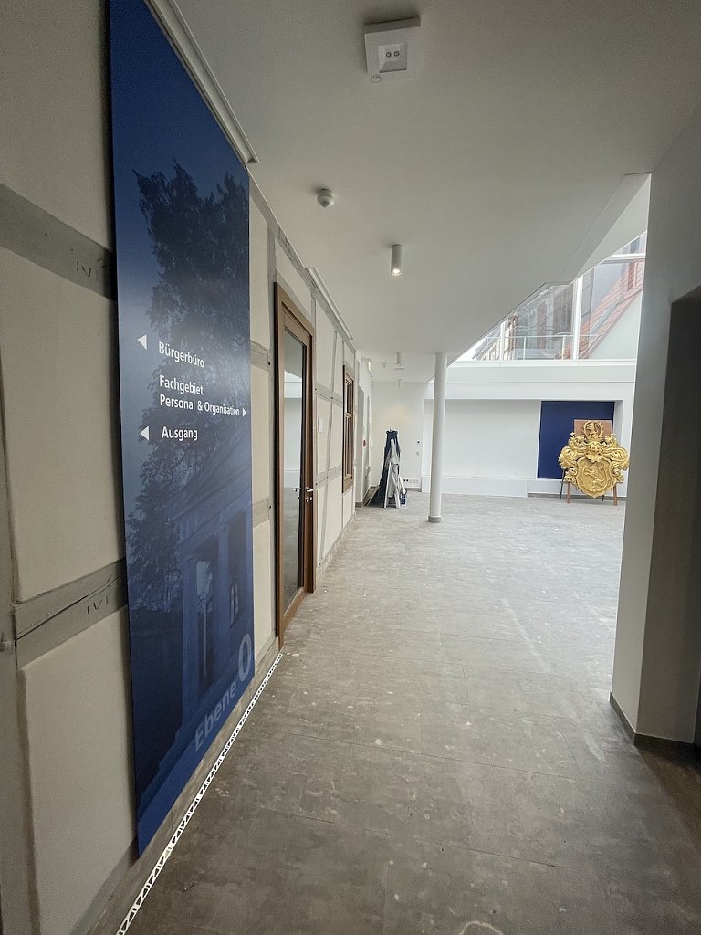 Der Ratssaal befindet sich ebenso auf dieser Ebene. In der obersten, im Vergleich zum alten Rathaus neugeschaffenen Ebene 4, arbeiten zukünftig die Mitarbeitenden des Fachgebietes Personal & Organisation. Neben den genannten Bereichen der Verwaltung in den Ebenen 0 bis 4, befinden sich im Untergeschoss des Rathauses der Trausaal sowie die ebenso völlig neu gestaltete Touristinformation. Wir freuen uns darauf, Sie bald im neu gestalteten Rathaus begrüßen zu dürfen. Es ist geplant am 3. Mai einen Tag des offenen Rathauses zu gestalten.
