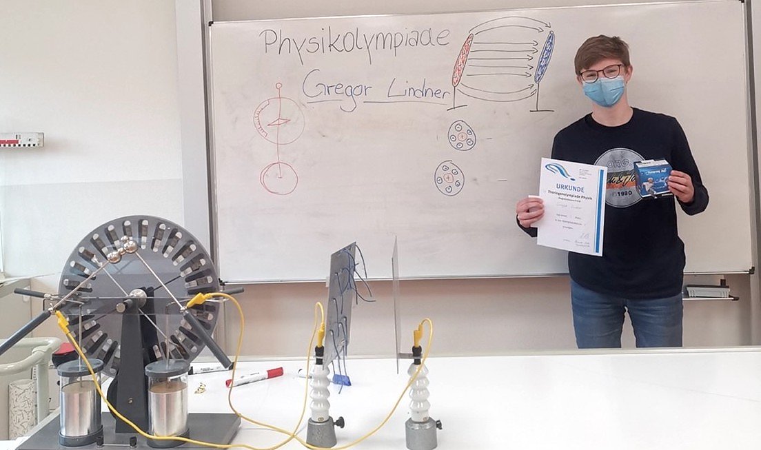 Durch sein sehr gutes Ergebnis beim Regionalausscheid qualifizierte er sich für die Endrunde der Physikolympiade, welche in Form eines Klausurtages in Erfurt stattfindet. Wir gratulieren zu deinem hervorragenden Ergebnis und wünschen viel Erfolg bei der Endrunde.