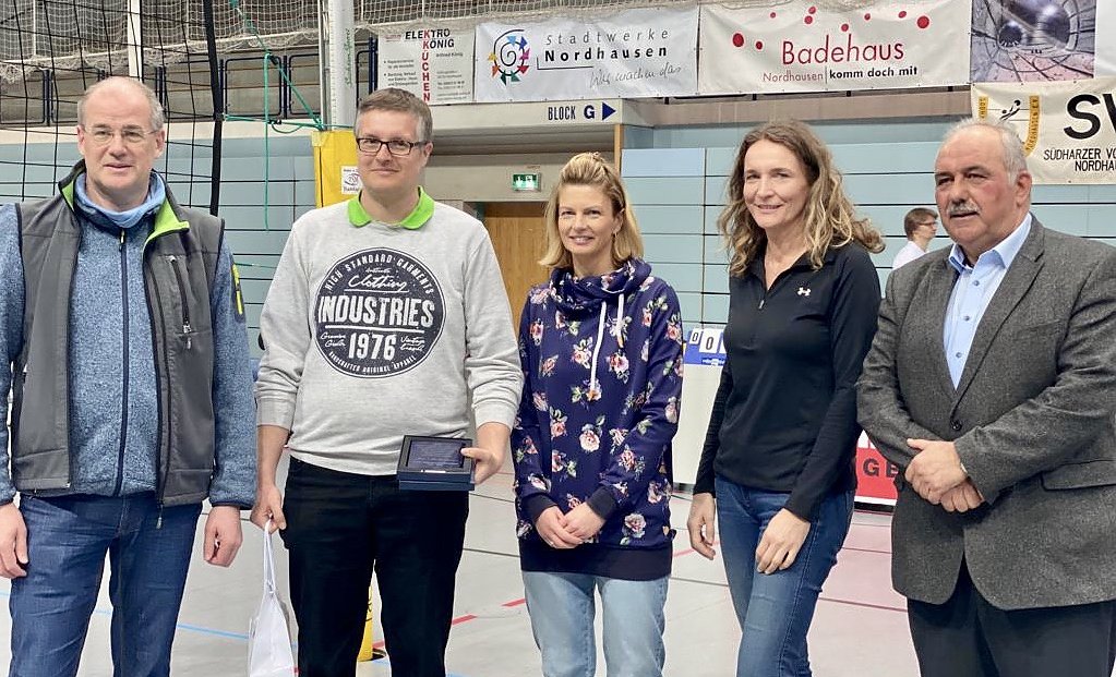 In der ersten Satzpause wurde der Autor für sein jahrelanges Engagement beim SVC, im Schulsport sowie Volleyball auf Kreisebene von Landrat Matthias Jendricke, der Bürgermeisterin der Stadt Nordhausen Alexandra Rieger und der EVN Geschäftsführerin Jana Zöller geehrt. Der Südharzer VC möchte sich an dieser Stelle bei allen Sponsoren, Förderern und Unterstützern für die gute Zusammenarbeit in der vergangenen Saison ausdrücklich bedanken!
