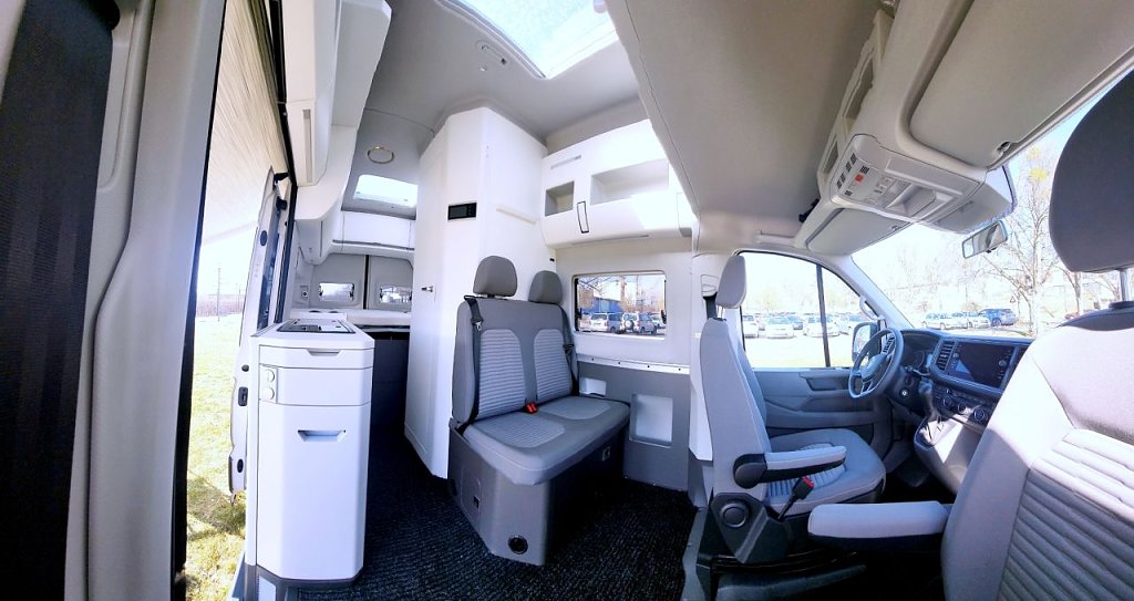 Der moderne Crafter ist dabei mit allerhand Annehmlichkeiten ausgestattet. Hierzu gehören neben einer Küche mit Gasherd und Kühlschrank auch eine Dusche, ein WC oder ein Camping-Tisch samt Stühlen. Insgesamt vier Schlafplätze, die wahlweise für zwei Erwachsene und zwei Kinder oder drei Erwachsene gedacht sind, stehen zur Verfügung. Durch eine separate Batterie ist es möglich, zeitweise auch einmal ohne Stromanschluss und abseits der Zivilisation zu campen. Gefahren werden kann das Wohnmobil durch seine kompakte Größe und sein geringes Gewicht bereits mit der Führerscheinklasse B.