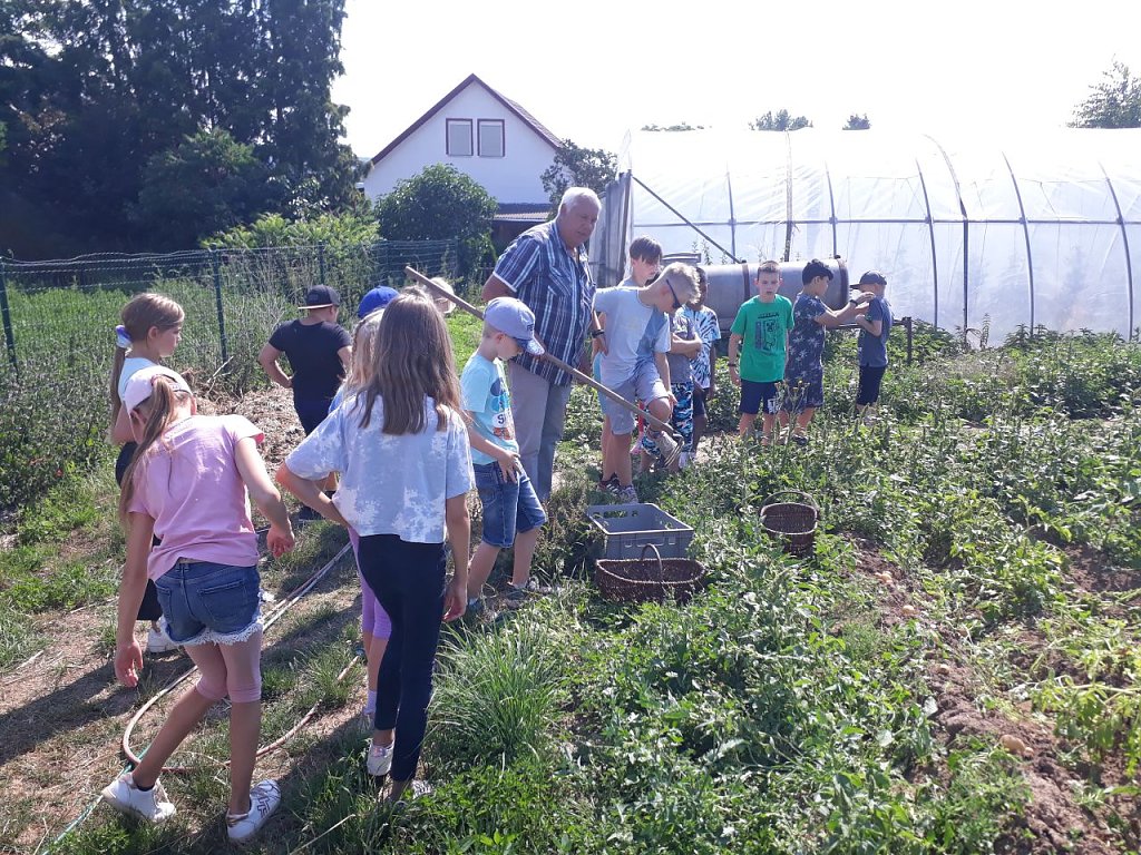 Ausführlich wurde von Herr Werner erklärt, wie seine Haustiere gehalten werden und welche Pflanzen auf seinem Bauernhof wachsen, die man auch im Hofladen käuflich erwerben kann. Danach wurden von den Kindern selbst Kartoffeln gelesen, die von Herr Werner für die Kinder gererntet wurden.