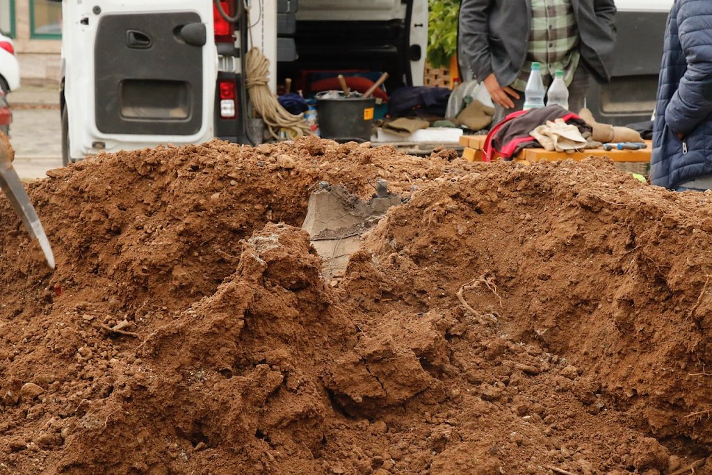 Statt wie angekündigt den großen, irdenen Quader gegenüber der Marktpassage erst am Nachmittag zwischen 13 und 14 Uhr anzubrechen musste man schon gegen elf Uhr Hacke und Spaten herausholen.