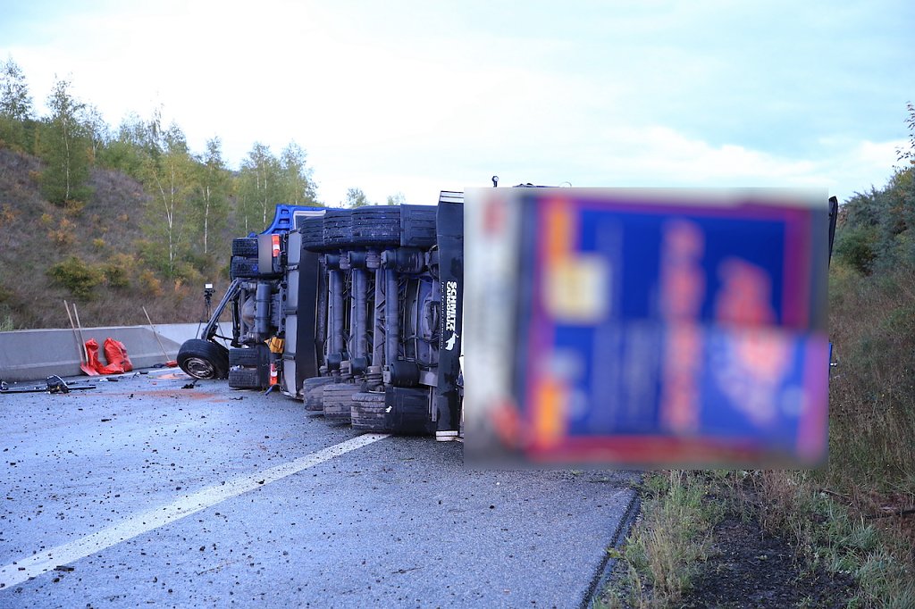 Der 25-jährige polnische Fahrer kam aus bisher ungeklärter Ursache nach rechts von der Autobahn ab und prallte an einen Wasserdurchlass. Dabei riss er sich das rechte Vorderrad ab. Das Fahrzeug rutschte im weiteren Verlauf über die Autobahn, prallte in eine Gleitschutzwand aus Beton und stürzte dann auf die Seite. Betontrümmer schleuderten auf die Gegenfahrbahn und beschädigten dort einen vorbeifahrenden Transporter.