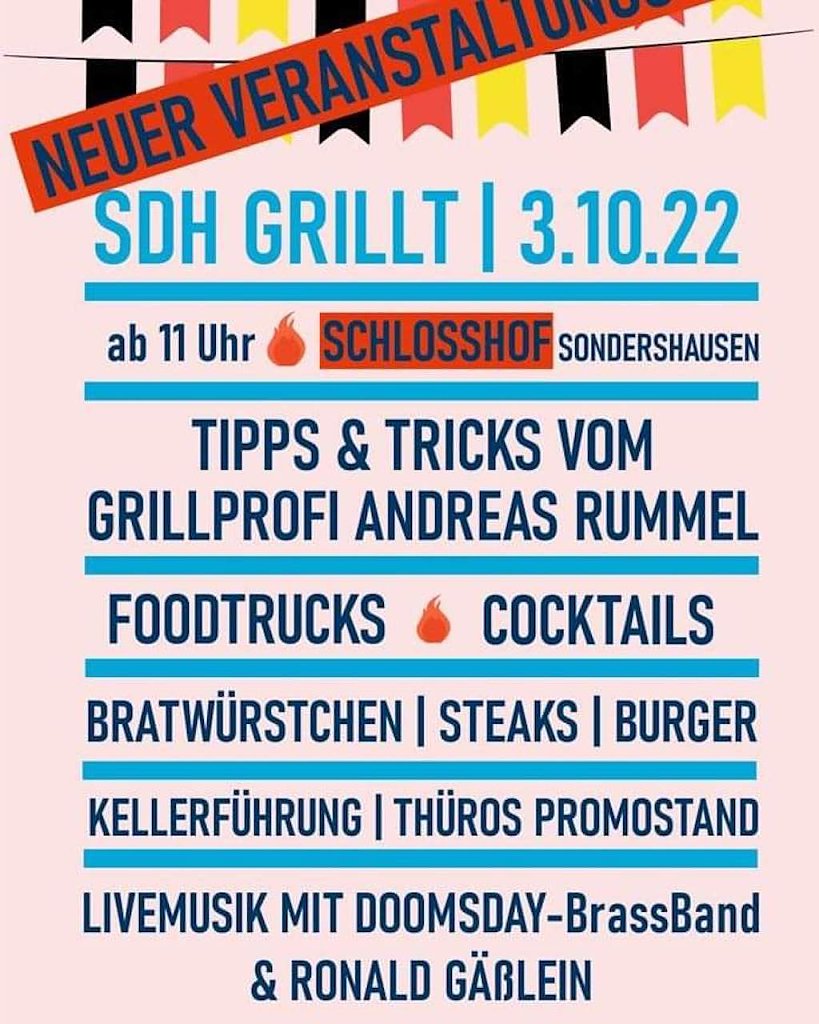 Ebenfalls um 11 Uhr beginnt erstmals ein weiteres Highlight im Schlosshof von Sondershausen. Unter dem Namen Sondershausen Grillt präsentieren verschiedene Grillprofis kulinarische Besonderheiten, darunter Andreas Rummel, der sich durch seine einzigartigen Kreationen bereits deutschlandweit einen Namen gemacht hat.