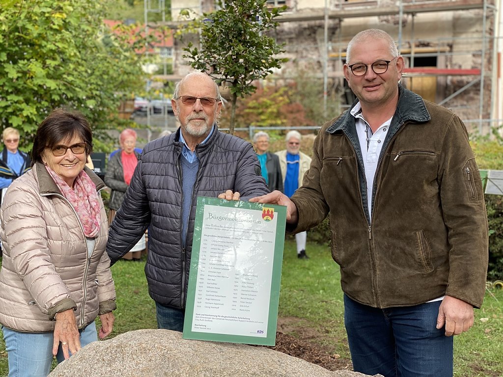 Eröffnet wurde die Baumpflanzung von der Trachtengruppe und den Ventilhornbläsern. Dank der guten Vorbereitung der Bauhofmitarbeiter von Harztor blieben für Ortschaftsbürgermeister Mario Kühn, Peter und Ute Sieckel nur noch kleine Restarbeiten bei der Pflanzung zu erledigen. Für den Bürgermeisterbaum recherchierte Neustadts Ehrenbürger und Ortschronist, Ruppert Ströbele, über 300 Jahre in die Vergangenheit, bis in das Jahr 1716. Georg Zacharias Werther wurde in diesem Jahr als Bürgermeister der Ortschaft gewählt und mit ihm beginnt die verglaste Chronik der vergangenen politischen Epochen der insgesamt 28 Ortschefs. Wir danken Norbert Grahl für die Umsetzung der Gestaltung der Tafel und Familie Rhesa, die ihren Granitfindling der Gemeinde überließ, auf dem die Tafel angebracht werden soll, freuten sich Mario Kühn und Peter Sieckel über die Umsetzung des Projektes Bürgermeisterbaum.