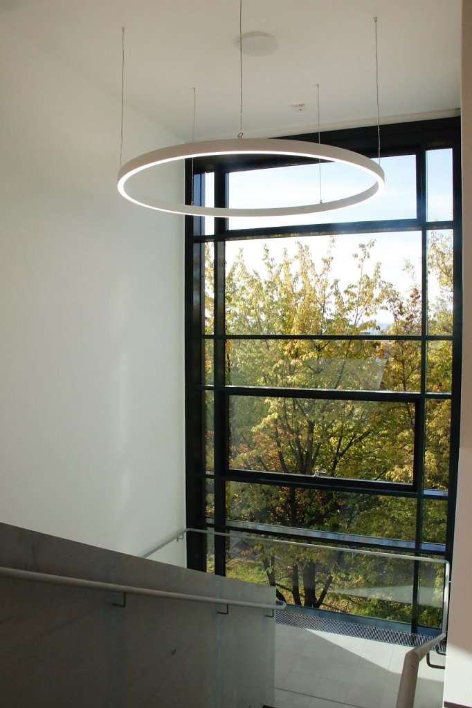 Das Gebäude stammt aus den frühen 1970er Jahren und trotz des Alters entschied man sich für eine Sanierung im Bestand und gegen einen kompletten Neubau. Die üblichen Überraschungen, die bei genauerer Betrachtung altgedienter Bausubstanz häufig auftreten waren aber einmal nicht das Kernproblem. Vielmehr hatten die Bauherren aus dem zuständigen Erfurter Ministerium mit den Gewerken zu kämpfen. Von denen arbeiteten immerhin 36 an der zügigen Umsetzung der Pläne. Und zwei taten es nicht, oder zumindest nicht wie erwartet, was auch noch juristische Zwischenspiele mit sich brachte. Hinzu kamen generelle Personalprobleme und die Corona-Krise, wobei diese hier einmal ihr Gutes hatte: Dank der digitalen Lehre brauchte die Hochschule die Räumlichkeiten nicht mit der Dringlichkeit normaler Zeiten.