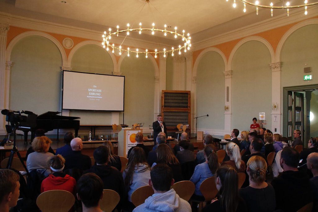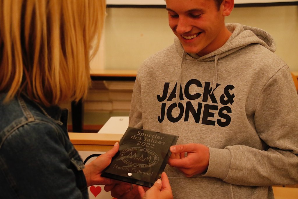 Die Ehrung der Sport-Asse hat am Humboldt-Gymnasium lange Tradition, konnte in den letzten Jahren pandemiebedingt aber nur in eingeschränktem Maße stattfinden. Gestern Abend freute man sich, endlich wieder in alter Form auftreten zu können und die besten Sportlerinnen und Sportler des Hauses zu würdigen. Der Sport habe unter Corona mächtig gelitten, sagte Schulleiter Volker Vogt, inzwischen sei man aber dabei wieder aufzuschließen. Die Personalfrage bleibe ein Spagat, so der Schulleiter weiter, vor allem dann, wenn nicht nur der Unterricht sondern auch Wettkämpfe und andere Events abgedeckt werden müssen.