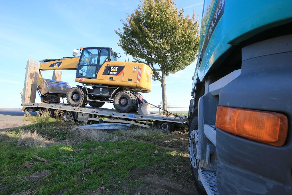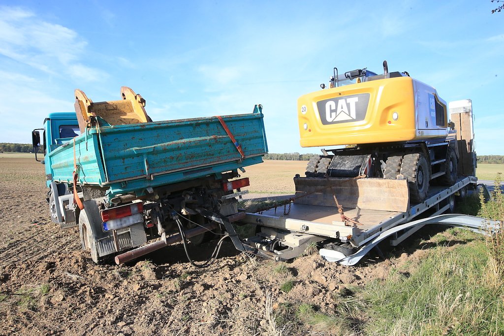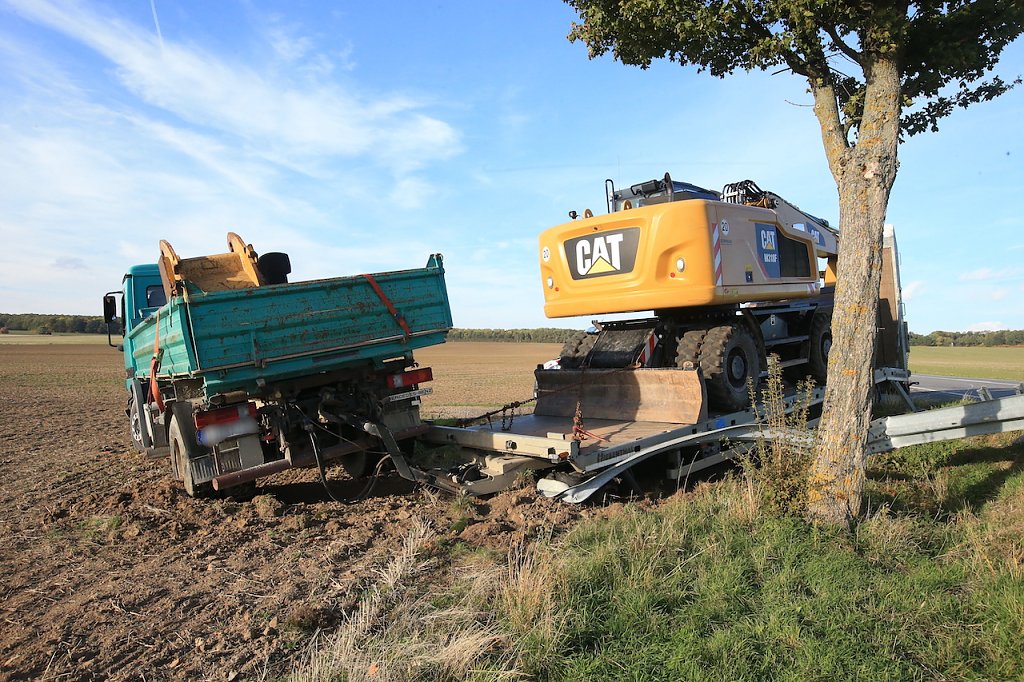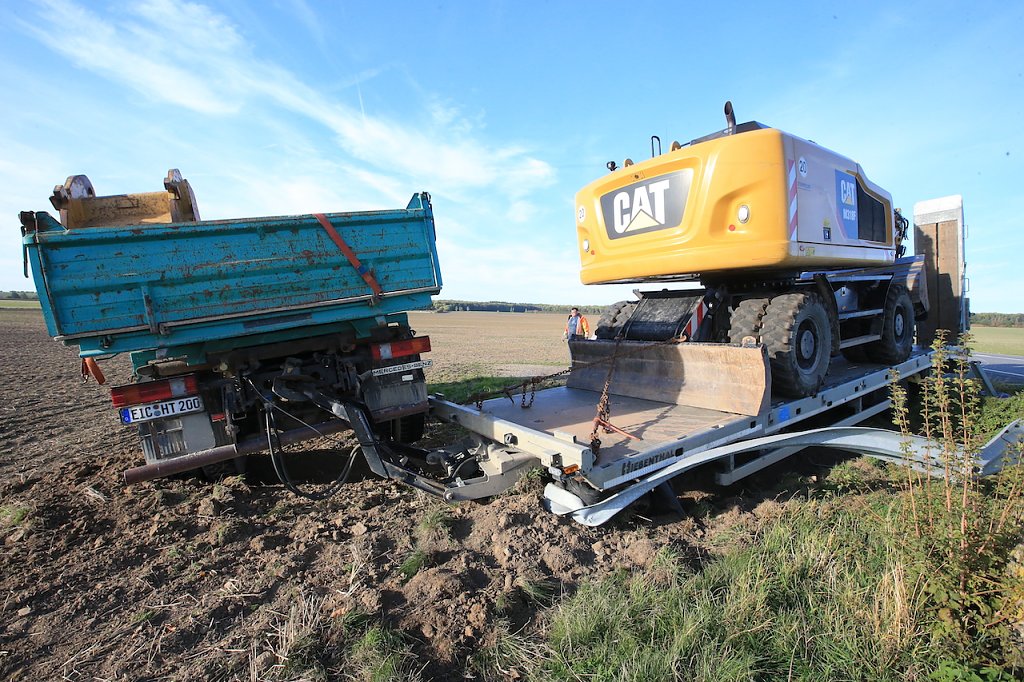 Ein weiterer Unfall ereignete sich knapp drei Kilometer weiter, ebenfalls in Fahrtrichtung Ebeleben. Ein LKW mit Tieflader-Anhänger, auf dem ein Bagger stand, befuhr die Landstraße in Richtung Ebeleben. Aus bisher ungeklärter Ursache löste sich an der Vorderachse das Tiefladers der linke Vorderreifen. Das Gespann kam ins Schlingern, dabei hebelte der Tieflader den LKW aus und schob ihn, glücklicherweise, in eine Feldzufahrt. Hier kam das Gespann auf dem Acker zum Stehen.