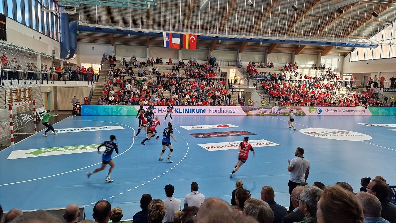 Mit der stabil und kompakt stehenden Abwehr hatten die Gäste einige Probleme. Nach toller Parade von Irma Schjött kam der Ball zu Johanna Stockschläder, die pfeilschnell gestartet war und zum 14:10 abschloss. Noch knapp zweieinhalb Minuten waren zu spielen. Die Gäste beherrschten das erfolgreiche Tempogegenspiel ebenfalls. Das zeigte Manon Houette nur eine Minute später. Eine letzte Parade von Irma Schjött, dann pfiffen die türkischen Schiedsrichterinnen die erste Halbzeit beim Stand von 15:12 ab.