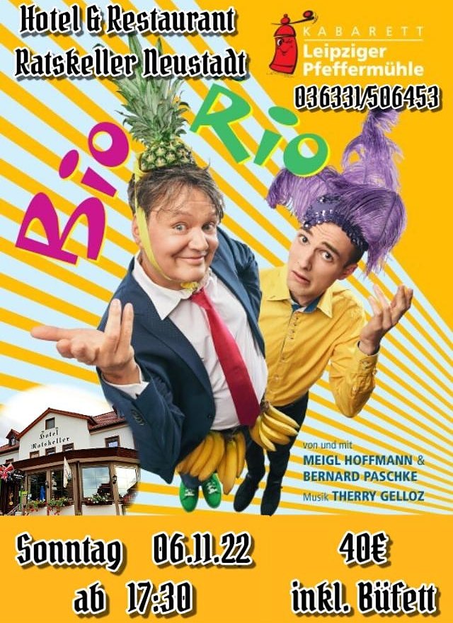 Dort sind Frank Pojtinger und sein Team für den Gaumen-Genuss zuständig. Während die Pfeffermüller für den akustischen Wahnsinn verantwortlich zeichnen. Sie stolpern über herrliche Pointen, aber sind dabei nicht auf den Mund gefallen. Kabarett, Klavier und Karneval: Es erwarten Sie Zuckerhut und Peitsche. Machen Sie sich gefasst auf ein satirisches Programm zwischen Samba und Ramba-Zamba.Hoffmann und Liebermann, zwei Wortakrobaten beim humoristischen Drahtseilakt über den Abgründen unserer Zeit - Alt und Jung, Ost und West, Dick und Doof. Hereinspaziert, hereinspaziert, heißt es ab 17.30 Uhr! Der "Kampf" um die letzten Restkarten für das Kabarett inklusive eines exklusiven Menüs beginnt heute und kann unter 036331 - 586453 "aufgenommen" werden.