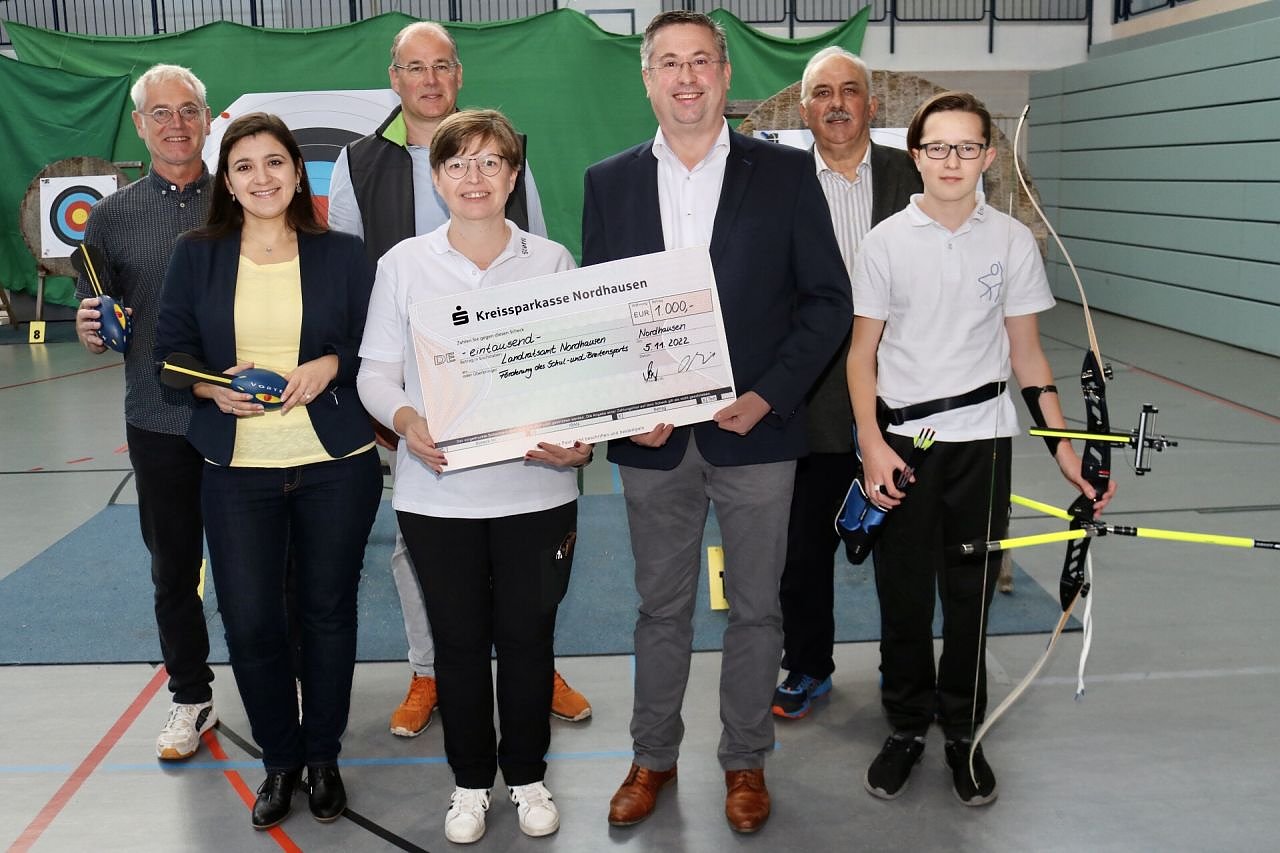 Zur Kreismeisterschaft im Bogenschießen hat die Stiftung der Kreissparkasse Nordhausen eine Sportförderung über jeweils 500 Euro an den Verein Bowteam Nordhausen sowie an das Humboldt-Gymnasium Nordhausen übergeben. Symbolisch überreichten Sparkassenvorstand Jan Oberbüchler und Verwaltungsratsvorsitzender Landrat Matthias Jendricke die Förderung über insgesamt 1.000 Euro (Foto: Pressestelle Landratsamt)