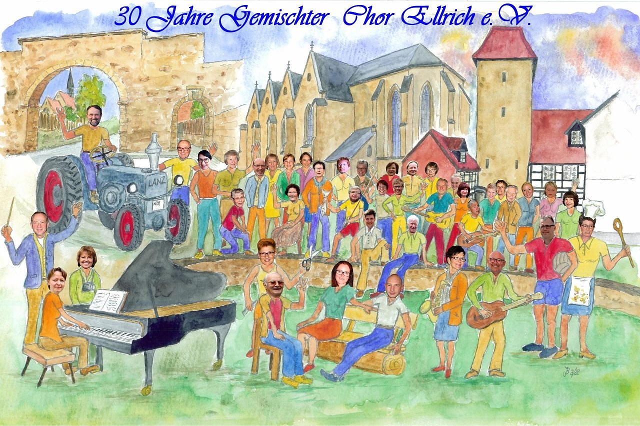 Das Bild zu unserem Jubiläum, auf dem alle zu diesem Zeitpunkt aktiven Chormitglieder verewigt wurden, entstand durch unseren Sangesfreund Joachim Becker, welcher auch viele Ellricher Wahrzeichen mit einfliesen ließ. Die technische Umsetzung verdanken wir Annabel Eichel. Es war eine gute Alternative da ein gemeinsames Foto zu Beginn des Jubiläumsjahres coronabedingt nicht möglich war.