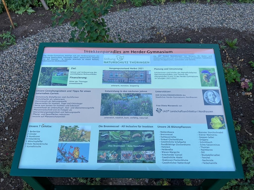 Hier haben Schülerinnen und Schüler des Naturwissenschaftlichen Zweiges der Klassenstufen 9 und 10 des Herder-Gymnasiums im Rahmen eines Förderprogramms der Stiftung Naturschutz Thüringen (SNT) Neues geschaffen. Dieses Förderprogramm, betitelt mit Naturschutz beginnt vor der Haustür – in kleinen Schritten zu einem bunten, lebenswerten Wohnumfeld, unterstützt Projekte, die dazu beitragen, die Natur im direkten Umfeld der Menschen zu schützen und zu verbessern. Zur Finanzierung kann dabei auf Mittel aus der Thüringer Umweltlotterie zurückgegriffen werden.