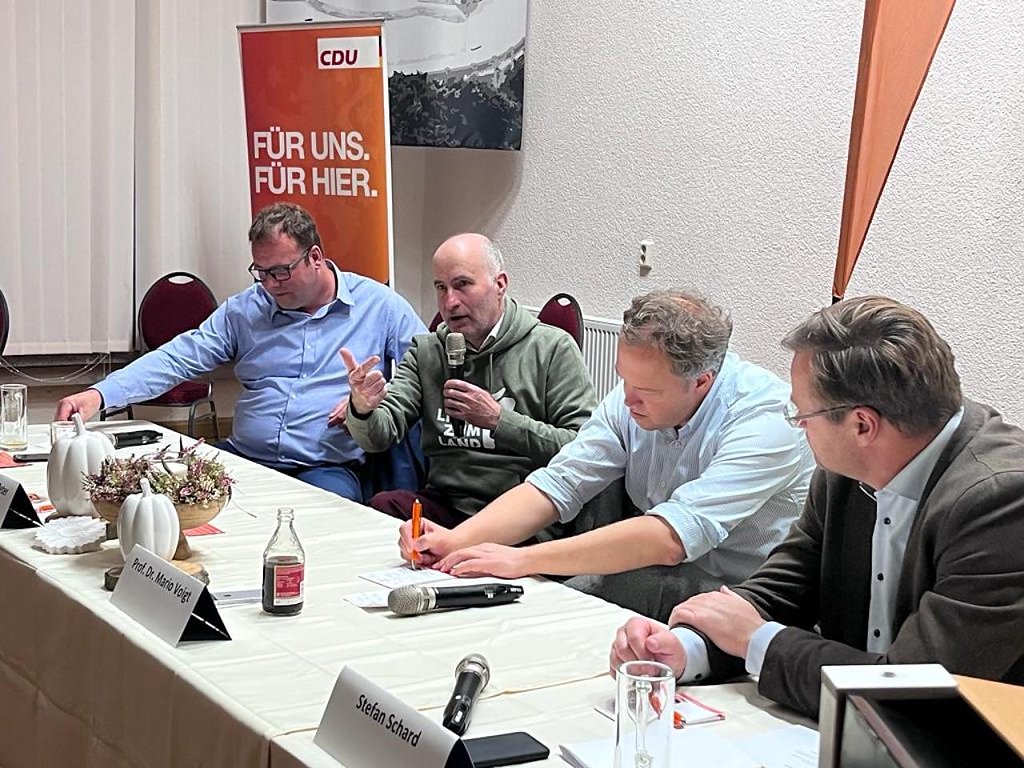 In der Diskussion mit dem Vorsitzenden des Kreisbauernverbandes, Dr. Wolfgang Peter, dem Thüringer CDU-Vorsitzenden und Vorsitzenden der Landtagsfraktion, Prof. Dr. Mario Voigt, dem sowie Sprecher für Landwirtschaft, Markus Malsch aus Südthüringen, und nat. Stefan Schard entwickelten sich intensive Gespräche mit den Gästen.