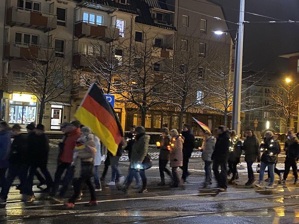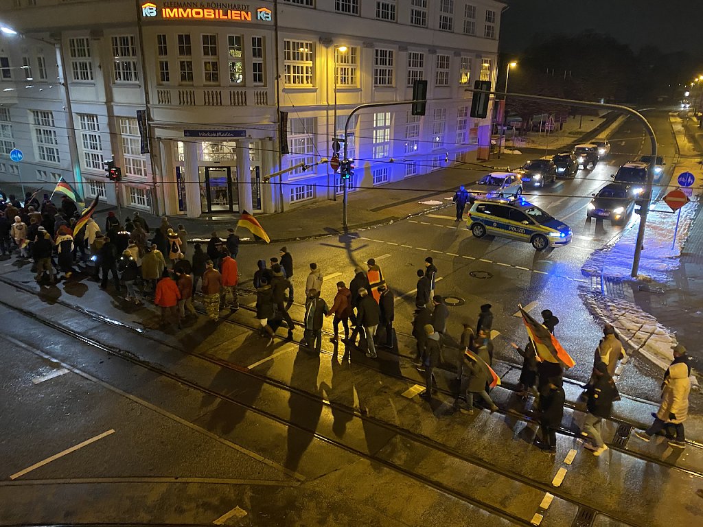 Angeführt von einer Musikanlage, aus der Lieder erklangen, die vom gemeinsamen Zusammenhalt auf der Straße handelten, liefen gut 300 Menschen trotz Dunkelheit, Kälte und Fußball-WM wie jeden Montagabend gegen 18.30 Uhr los. Viele von ihnen mit Transparenten, Fahnen, Trommeln und Tröten. Scholz muss weg wurde dabei immer wieder über eine Lautsprecheranlage skandiert.
