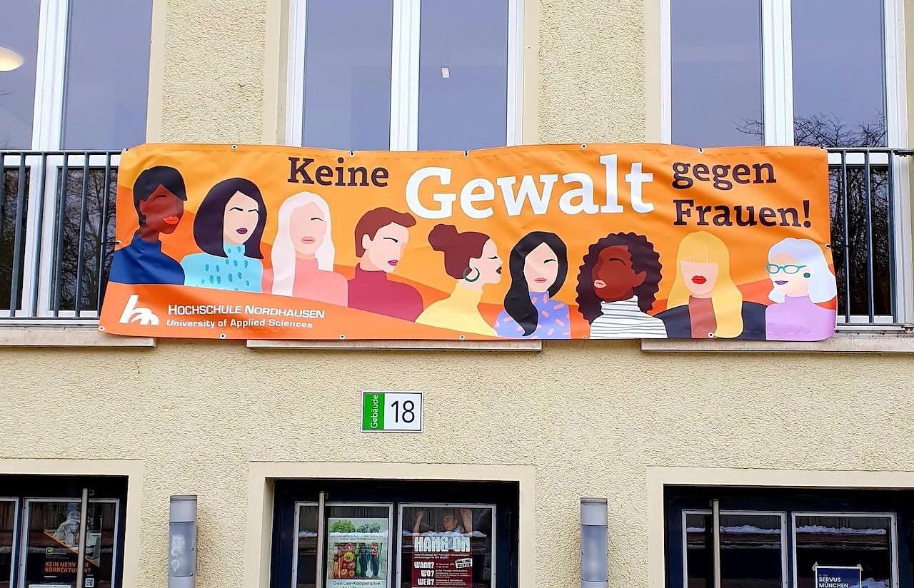 Mit dem Banner Keine Gewalt gegen Frauen! am Haus 18, mit Flyern und Aushängen im gesamten Hochschulbereich wird auf diese Menschrechtsverletzungen seitens der Hochschule Nordhausen aufmerksam gemacht.