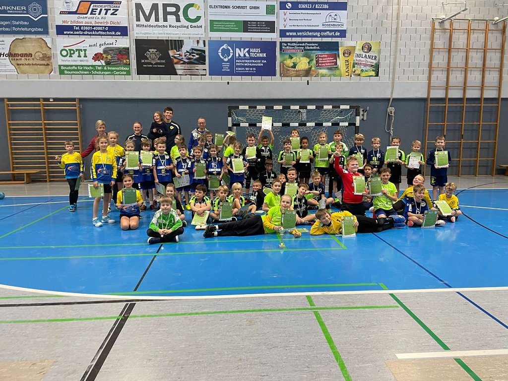 Danach gab es eine Leistungssteigerung. Mit schnellen Pässen und guter Abwehrarbeit holten sie sich den Erfolg. Insgesamt standen 2 Niederlagen 2 Siege gegenüber. In der Endabrechnung eines starken Teilnehmerfeldes mit Eisenach, Jena und 2 Teams vom Gastgeber belegten sie Platz 4. Am Ende wurden 2 Mädchen, 5 Jungs (davon 1 x Torhüter) ins All-Star-Team gewählt.
