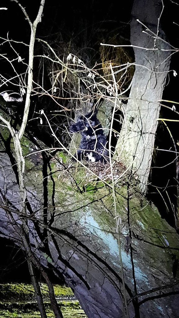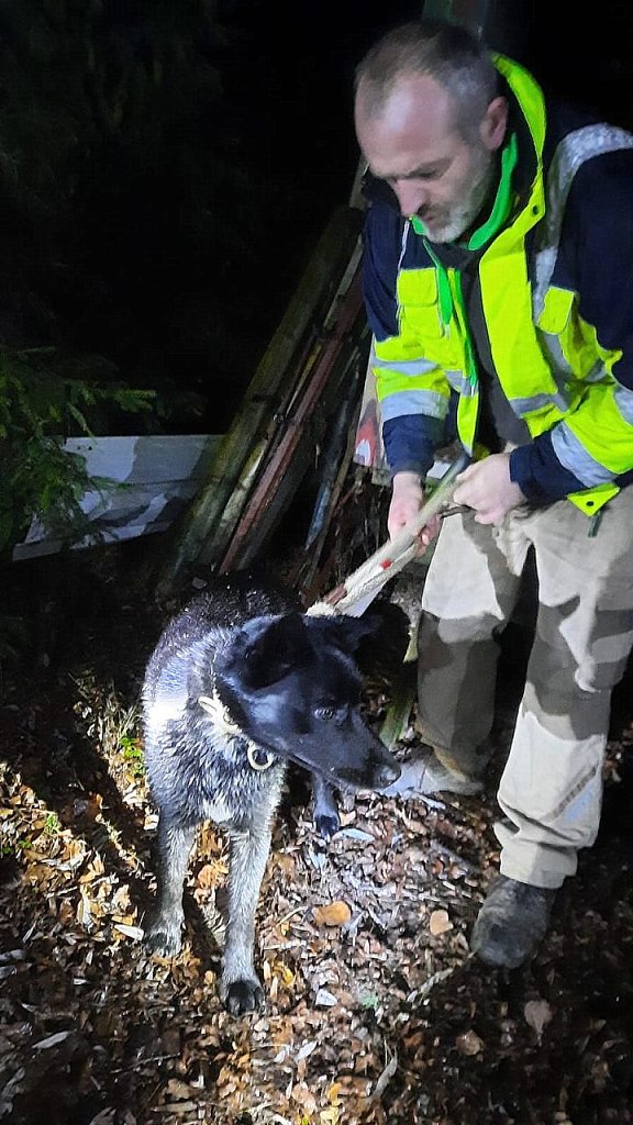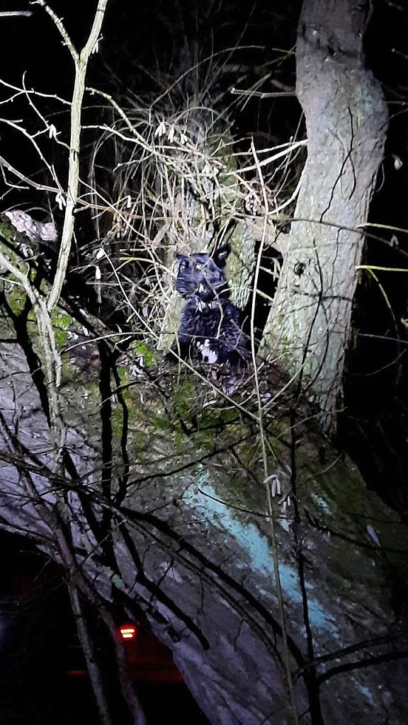 Da das Tier augenscheinlich nicht in der Lage war, den Baum alleine zu verlassen, wurde über die Rettungsleitstelle die Feuerwehr informiert, die sich der Sache annahm. Vor Ort bestätigte sich, dass ein größerer Hund auf einer Weide an einem Bachlauf saß.