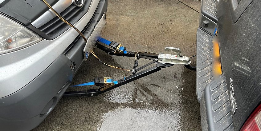 Nicht nur, dass der Selbstbau über keinerlei Auflaufbremsfunktion verfügte und die Stabilität sehr infrage zu stellen ist, die Anhängelast war dadurch ebenfalls überschritten. Der Fahrer wollte den Transporter mit der abenteuerlichen Vorrichtung von Großbritannien in die Ukraine transportieren.