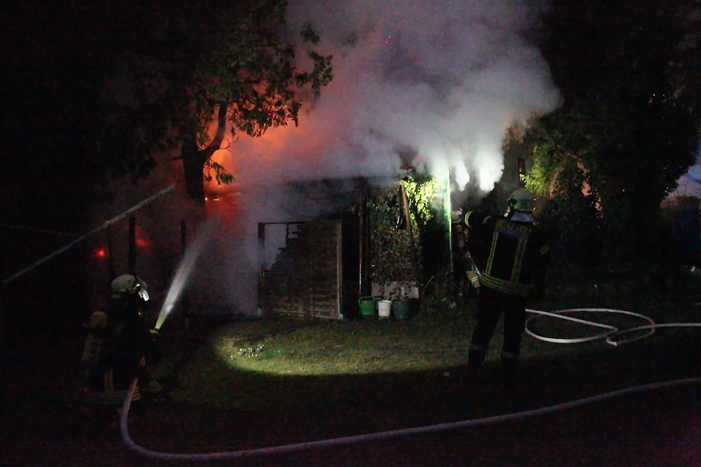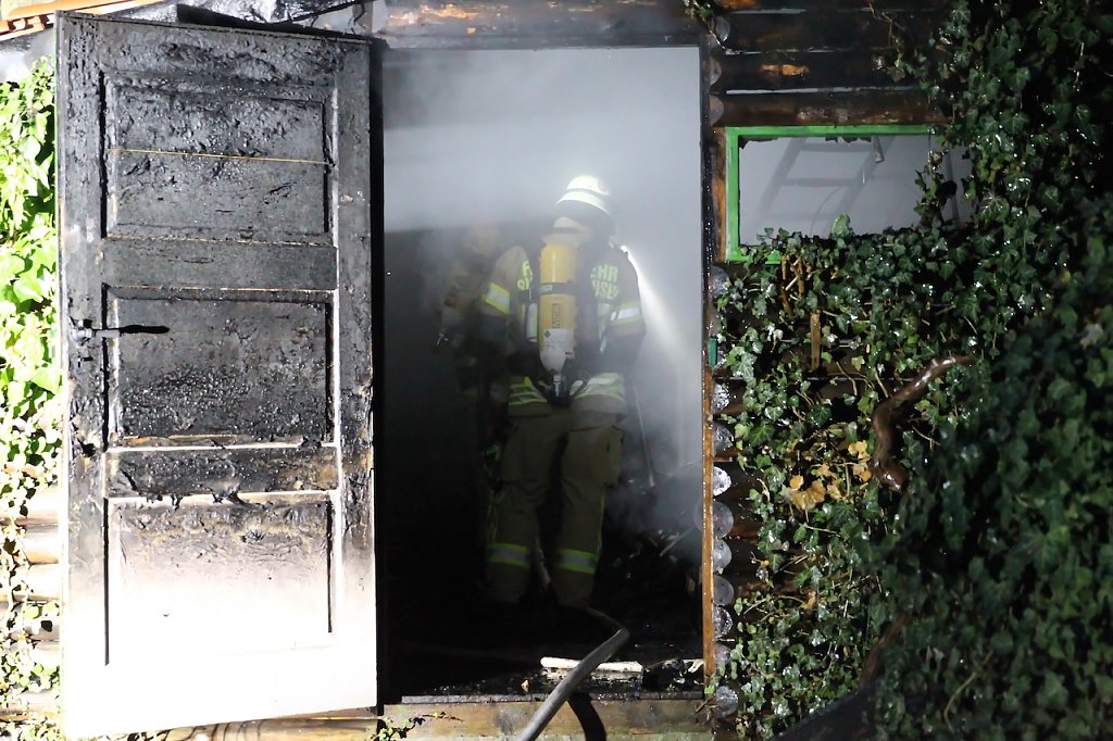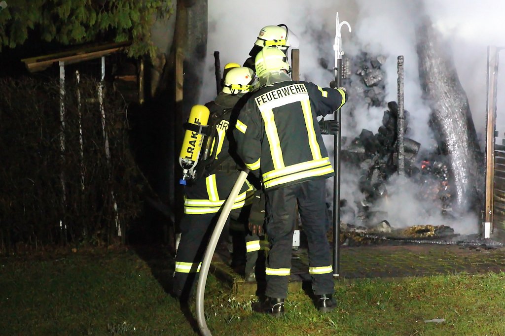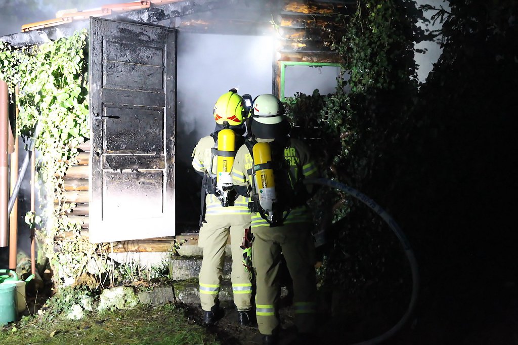 Beim Eintreffen der Einsatzkräfte fand man eine Schuppen im Vollbrand vor. Hierbei wurden ein Schuppen und ein angrenzender Holzstapel beschädigt. Ebenso wurden zwei große Lebensbäume in Mitleidenschaft gezogen. Mehreren Löschtrupps unter Atemschutz gelang es den Brand einzudämmen und das übergreifen auf ein angrenzendes Gebäude zu verhindern. Die Eigentümer so die Informationen vor Ort, waren zum Zeitpunkt des Brandes im Urlaub. Die Schadenshöhe beträgt mehrere tausend Euro.