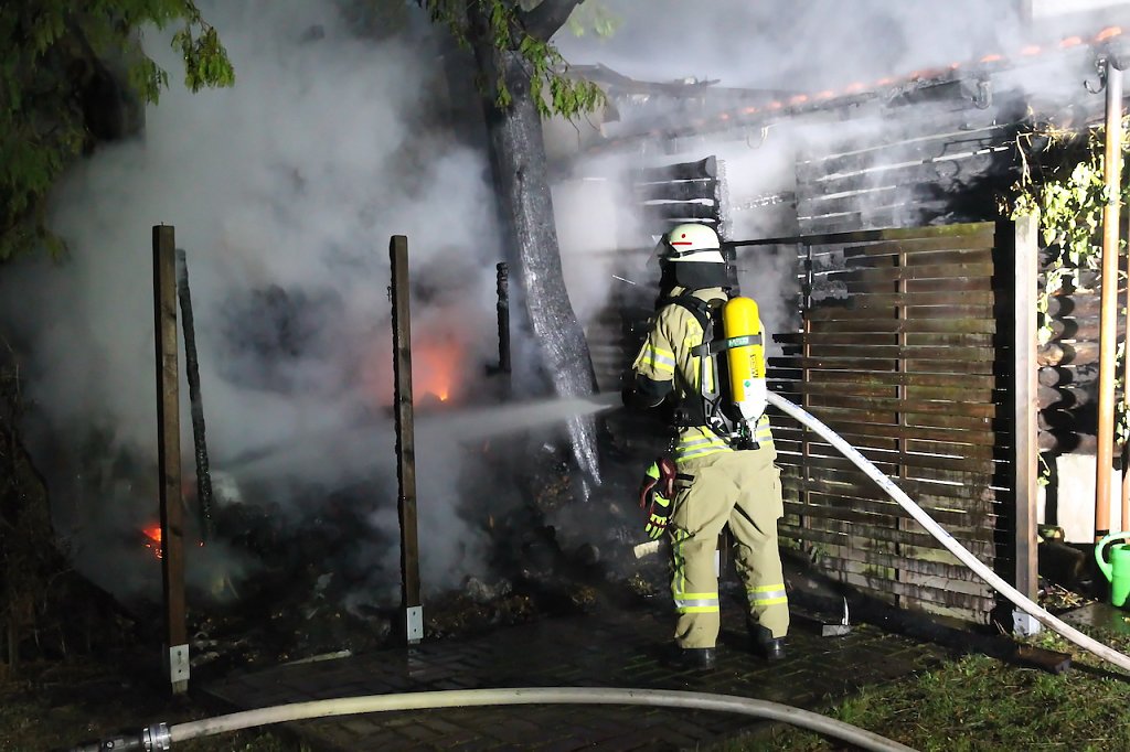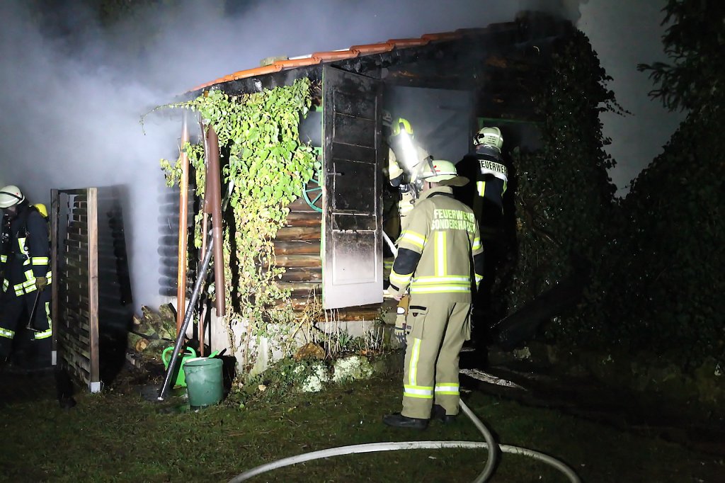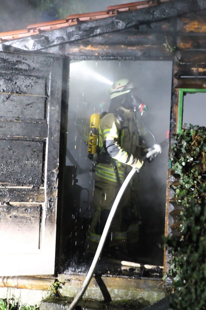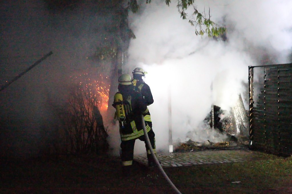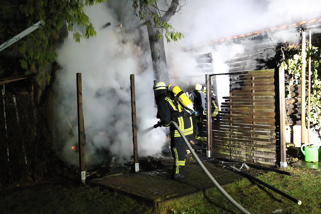 Beim Eintreffen der Einsatzkräfte fand man eine Schuppen im Vollbrand vor. Hierbei wurden ein Schuppen und ein angrenzender Holzstapel beschädigt. Ebenso wurden zwei große Lebensbäume in Mitleidenschaft gezogen. Mehreren Löschtrupps unter Atemschutz gelang es den Brand einzudämmen und das übergreifen auf ein angrenzendes Gebäude zu verhindern. Die Eigentümer so die Informationen vor Ort, waren zum Zeitpunkt des Brandes im Urlaub. Die Schadenshöhe beträgt mehrere tausend Euro.