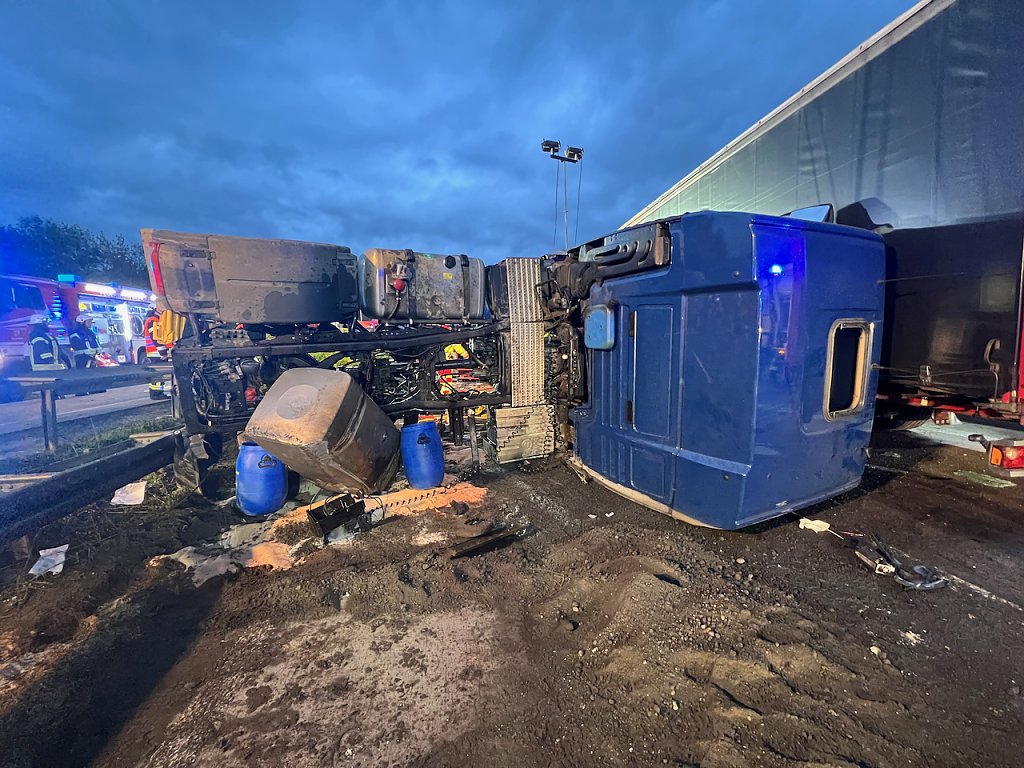 Nach bisherigen Erkenntnissen kam ein 56-jähriger Fahrzeugführer durch Unachtsamkeit mit seinem Sattelzug zunächst nach rechts von der Fahrbahn ab, durch starkes Gegenlenken kippte der LKW auf die Seite und kam anschließend auf der Fahrbahn zum Liegen.