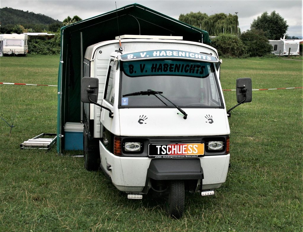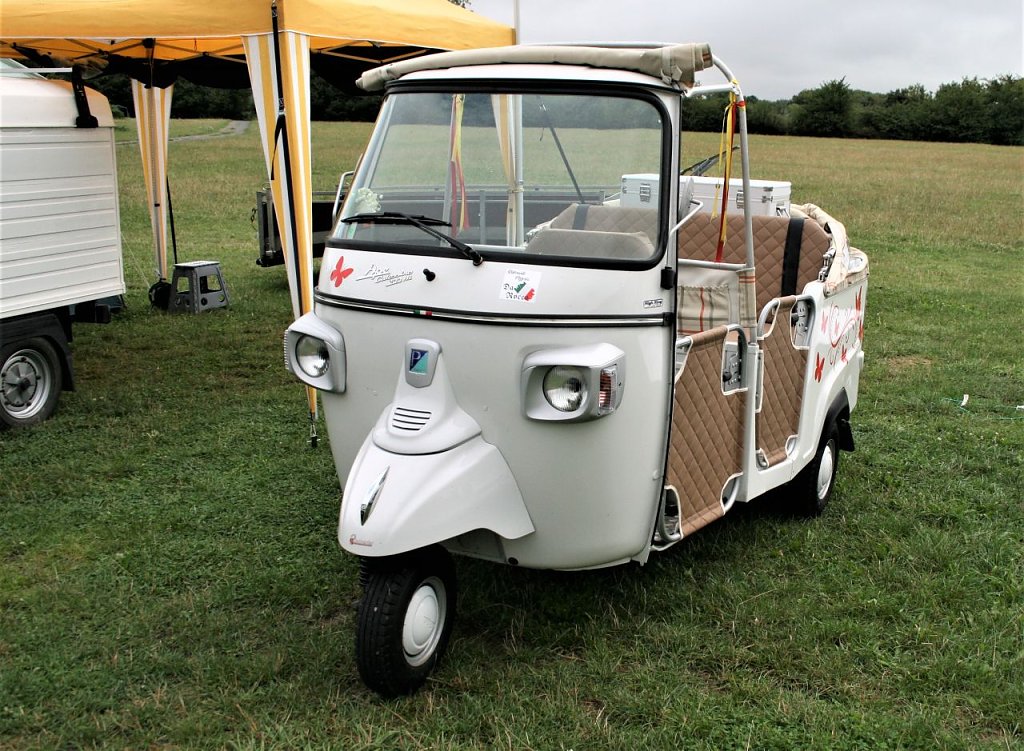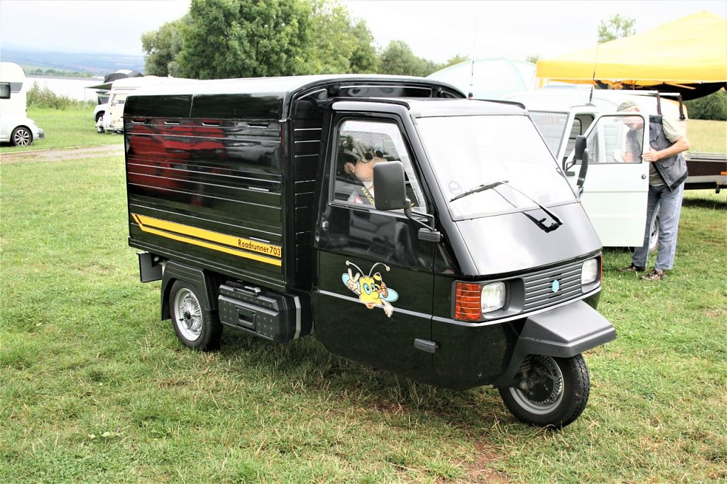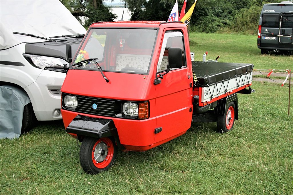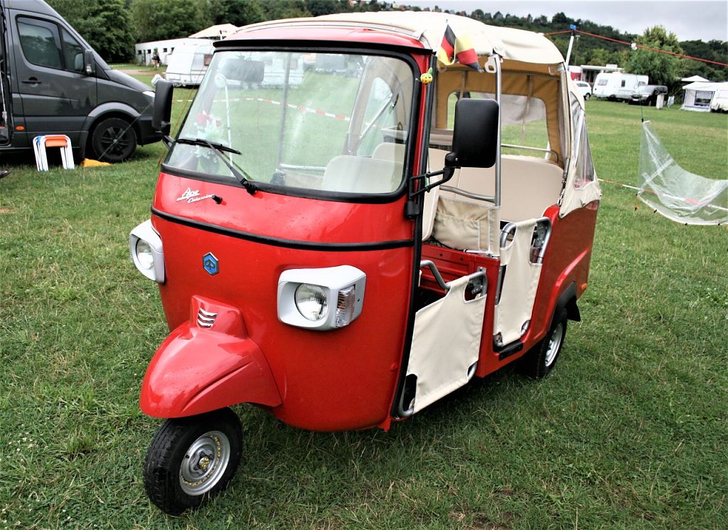 Der aus Italien stammende Dreirad- Transporter Ape (ital. Biene) kam ein Jahr nach der Vespa (ital. Wespe) auf den Markt von 1948, ist eigentlich eine Vespa mit Ladefläche.