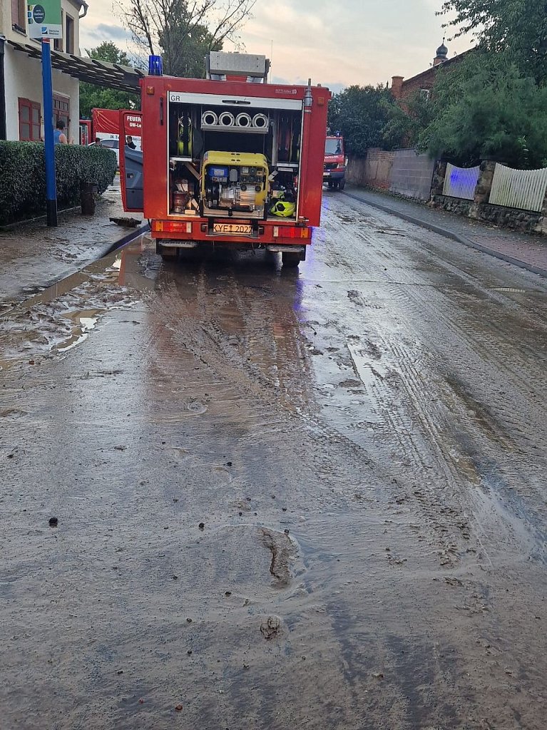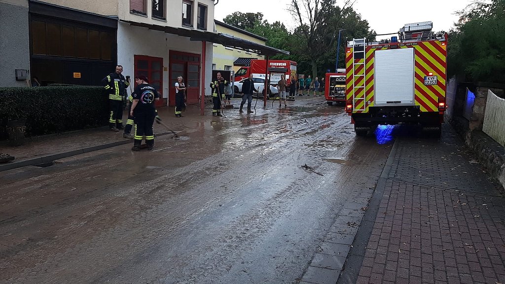 Damit die Einsatzkräfte verpflegt werden konnten, wurde der Einsatz- und Betreuungszug des Katastrophenschutzes alarmiert. Bis weit nach Mitternacht waren die Kräfte im Einsatz. Doch an Ausruhen oder gar Schlaf war für die Einsatzkräfte danach nicht zu denken. Gegen 4 Uhr ging erneut ein Gewitter mit Starkregen über der Region nieder und wieder mussten die Einsatzkräfte ausrücken. Auch dieses Mal hieß es, Keller leer zu pumpen, Straßen zu reinigen und natürlich Schlamm zu schippen. In Ebeleben standen neben einem Getränkemarkt auch mehrere Straßen unter Wasser, ebenso die Firma TR Plast.