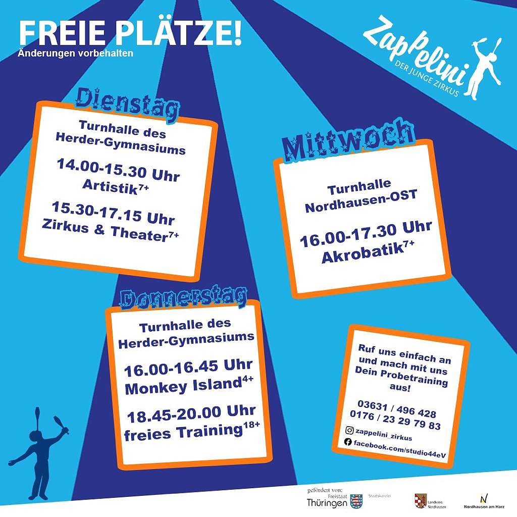 Immer dienstags treffen sich um 14 Uhr die Nachwuchs-Artisten und um 15:30 Uhr startet der Kurs Zirkus und Theater. Beide Kurse finden im Turnraum im Herder-Gymnasium statt und eignen sich für Kinder ab 7 Jahren. Am Mittwoch läuft von 16 bis 17:30 Uhr ein Akrobatik-Kurs in der Turnhalle der Grund- und Regelschule in Nordhausen-Ost, der sich ebenfalls an Mädchen und Jungen ab 7 Jahren richtet.